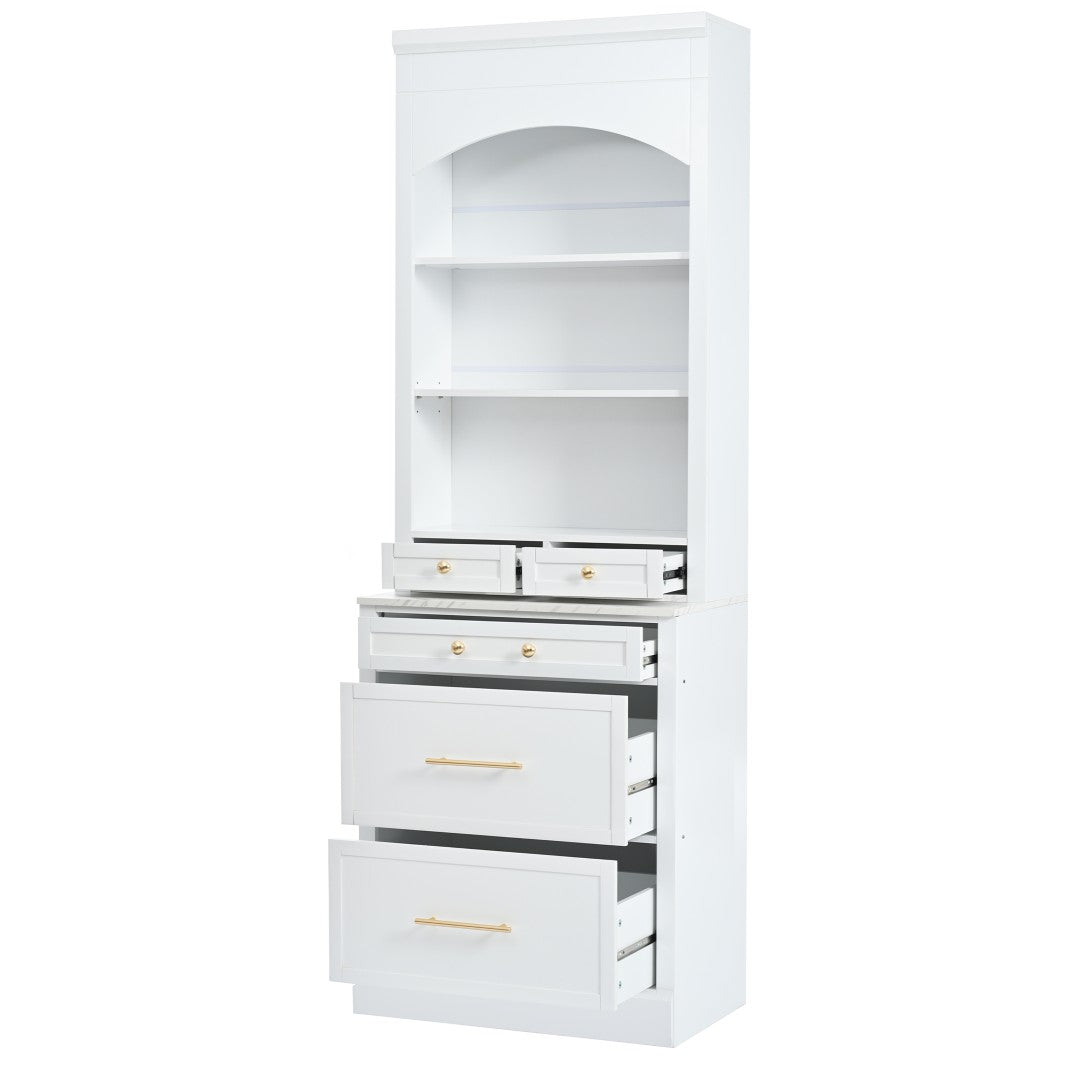 Bring style and smart storage to your kitchen with this tall, freestanding pantry that blends modern lines and a faux marble counter for a chic, functional centerpiece. Designed to maximize vertical space without sacrificing style, it offers a mix of concealed and open storage to keep dishes, small appliances, pantry items, and cookbooks organized and within easy reach.