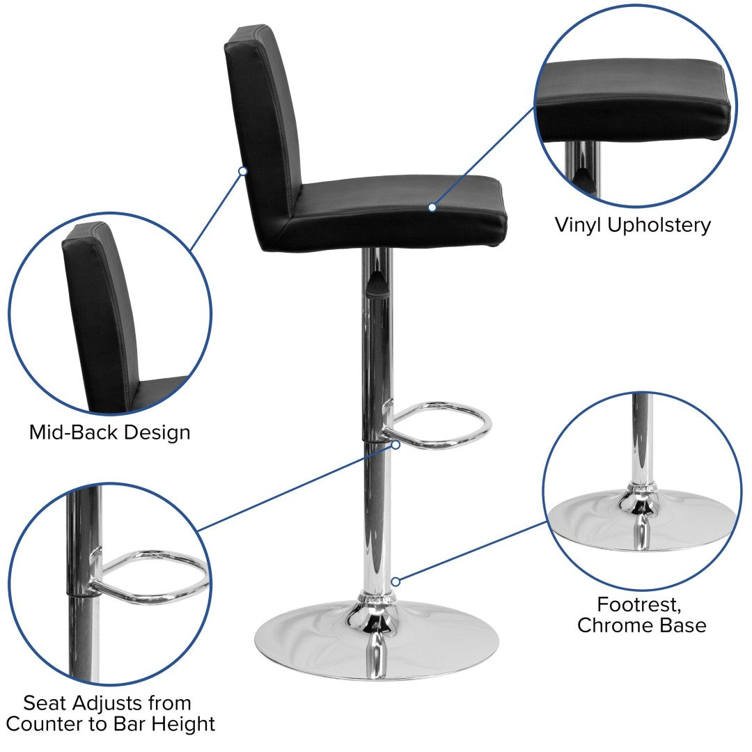 Relax in contemporary comfort with this sleek black vinyl barstool — a versatile addition to your kitchen island, home bar, or game room. Thoughtfully designed for everyday use, it pairs plush padding and a supportive panel back with smooth, height-adjustable swivel functionality and a polished chrome base for a modern, durable finish.