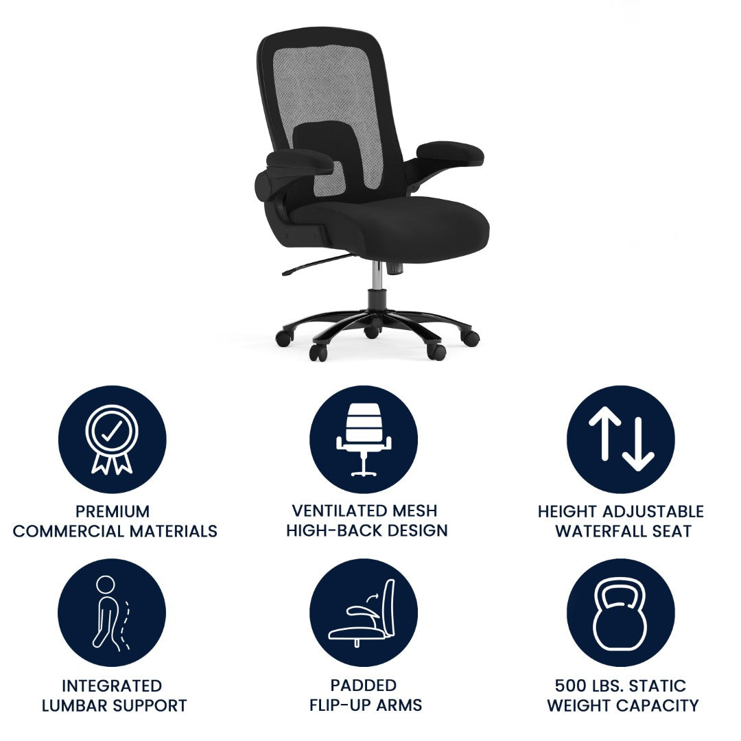 Upgrade your workspace with a professional, heavy-duty chair designed specifically for larger and taller users. This executive-style black mesh office chair combines breathable materials, reinforced construction, and ergonomic features—like lumbar support, a contoured waterfall seat, and adjustable tilt—to keep you comfortable and focused throughout long workdays without sacrificing mobility or style.
