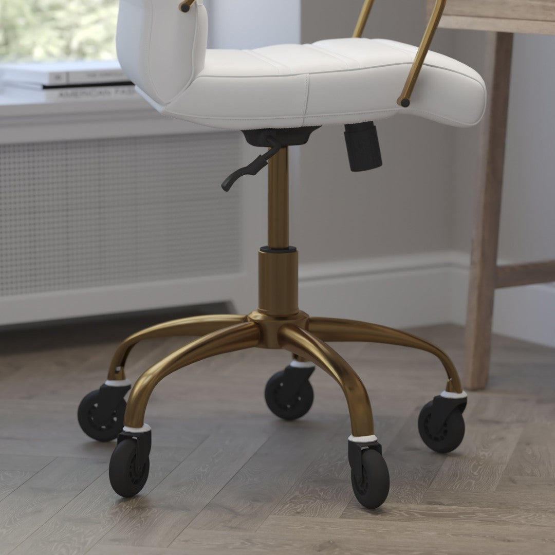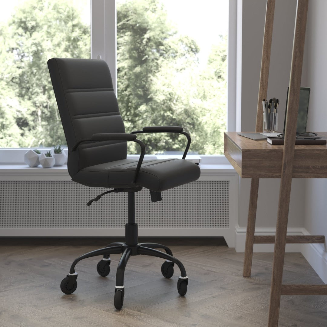 Bring comfort, support, and refined style to your workspace with this mid-back executive office chair. Thoughtfully designed for long periods at your desk, it pairs LeatherSoft upholstery and padded arms with ergonomic features—so you stay comfortable and productive without sacrificing a professional look.