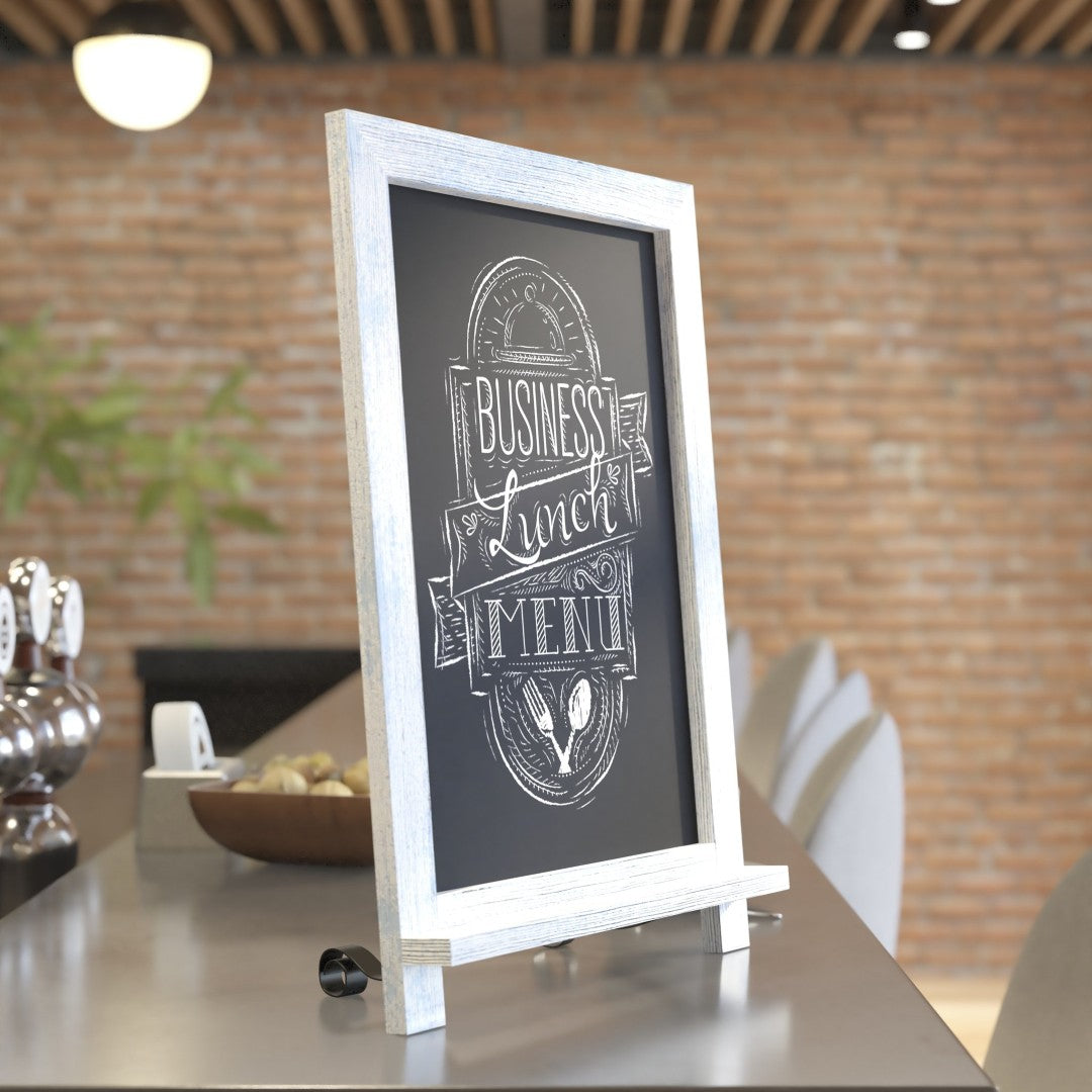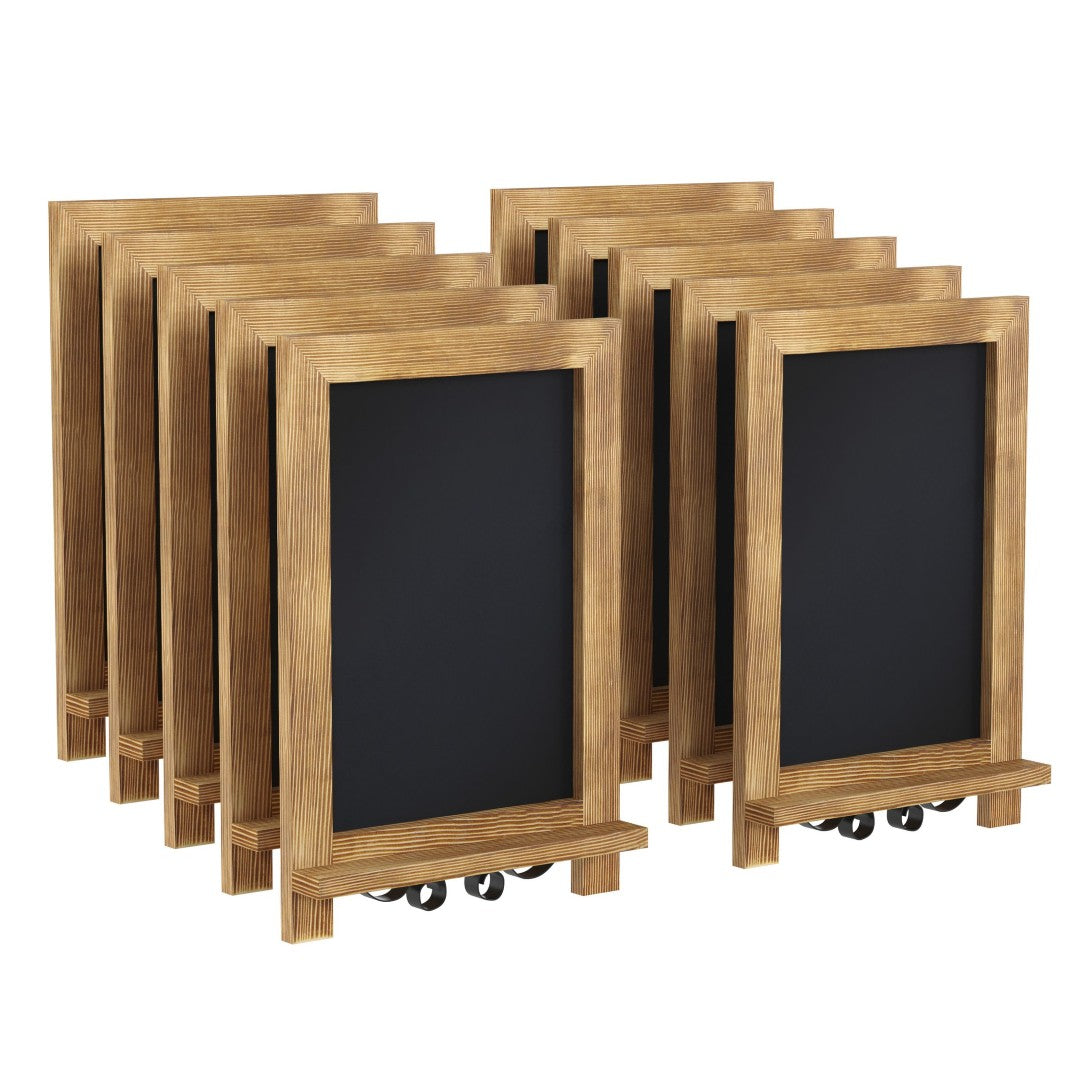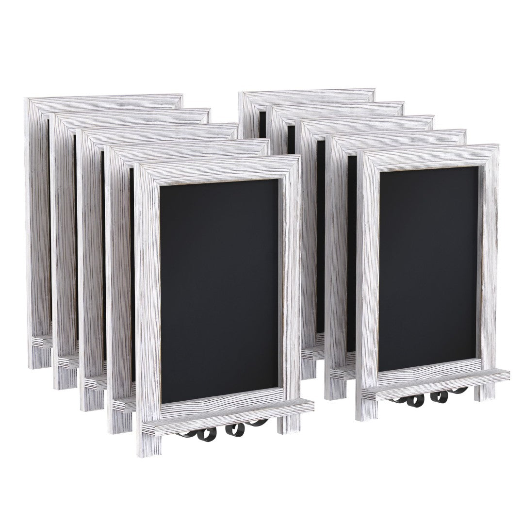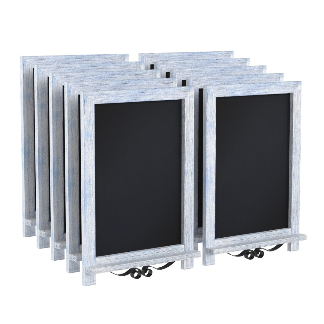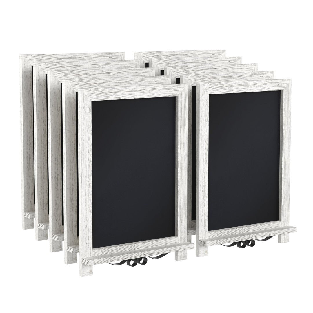 Keep your home or business organized with this elegant set of 10 weathered tabletop chalkboards. Each board pairs a classic distressed pine frame with a durable, non-porous porcelain steel writing surface that works with liquid chalk markers or traditional chalk. Use them freestanding on counters and tables or fold the scrolled metal legs and hang them on the wall for a polished message center — perfect for menus, reminders, seating assignments, or event signage.