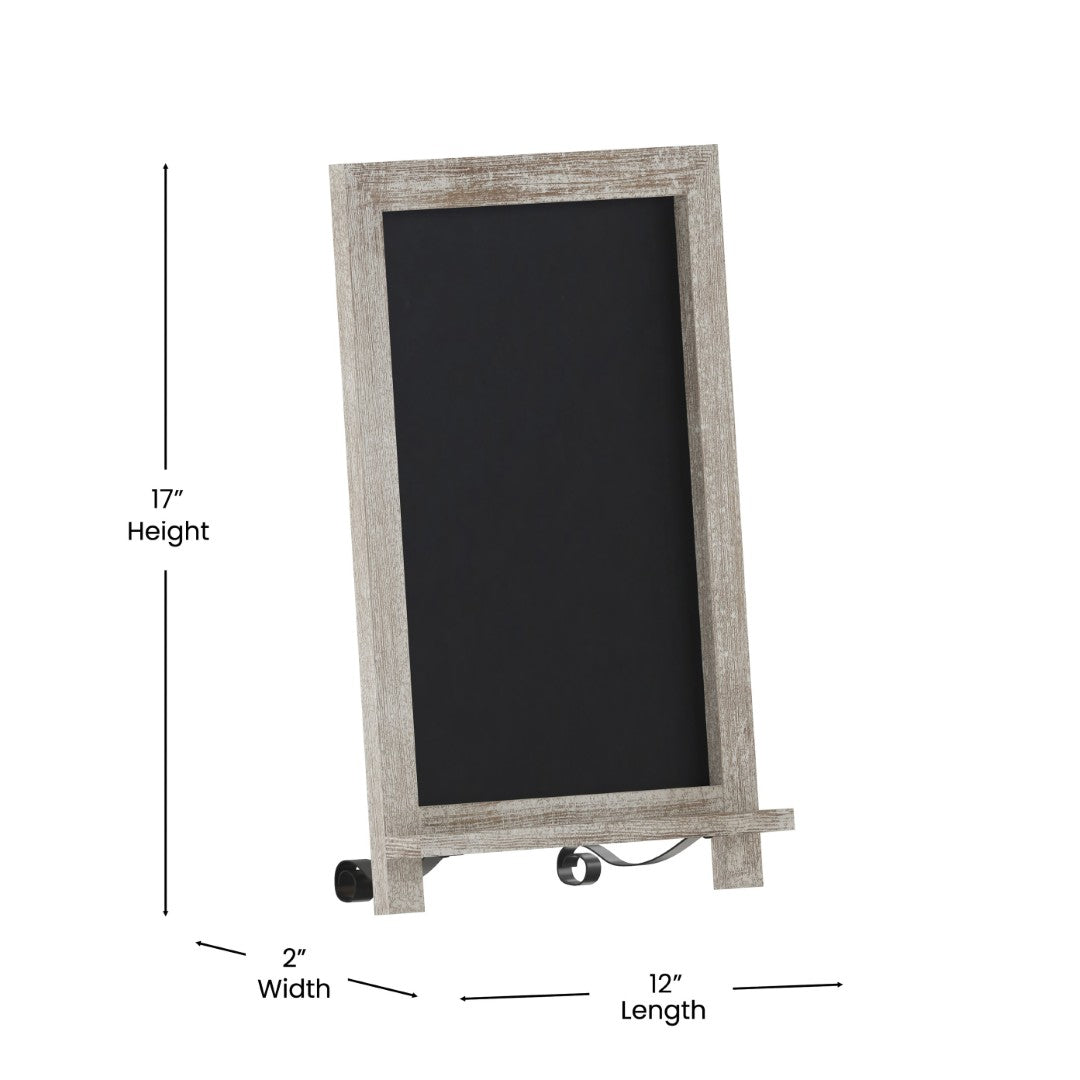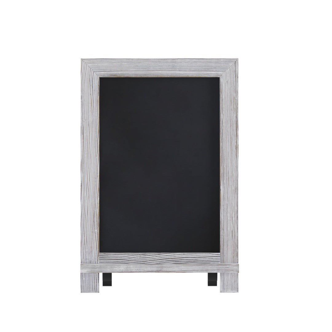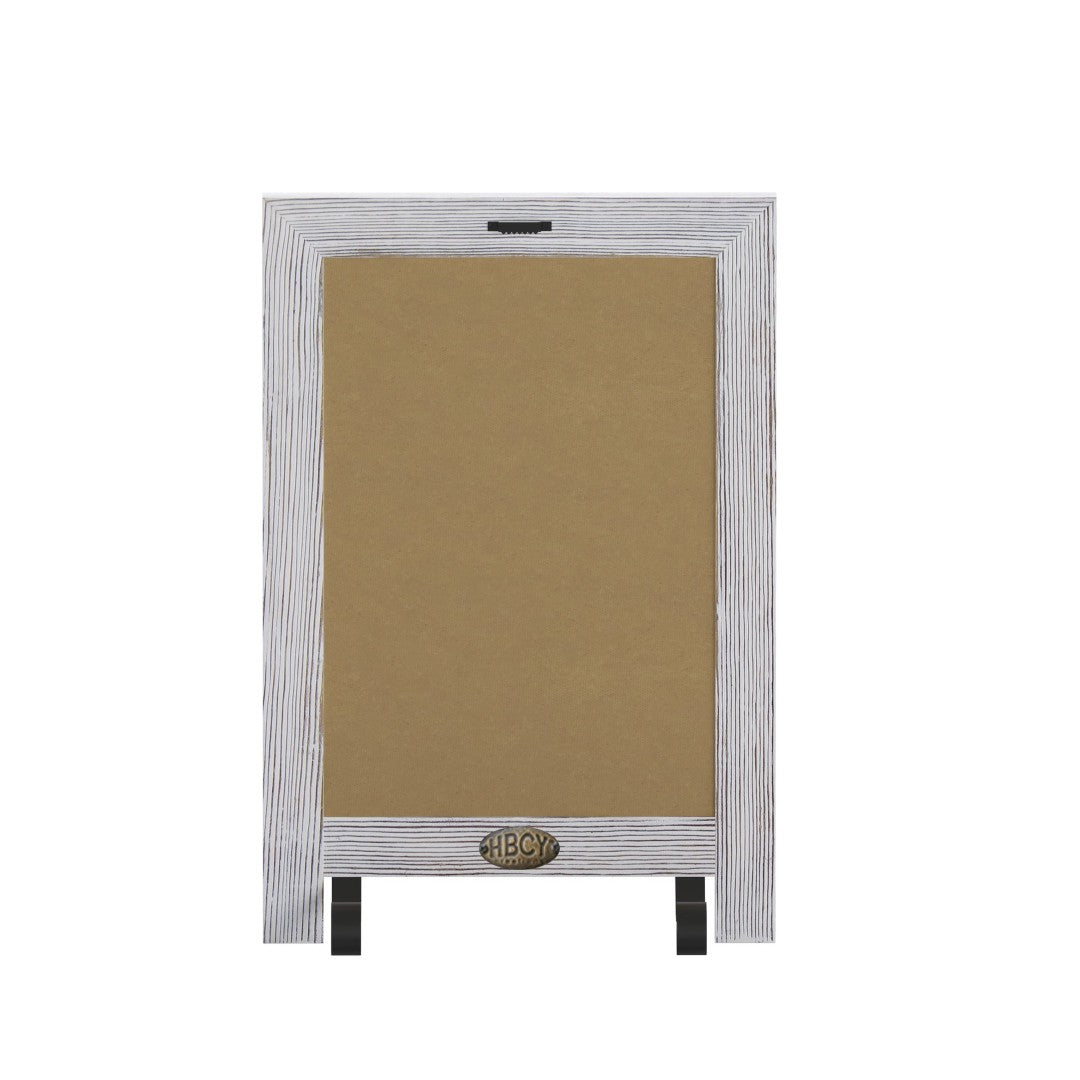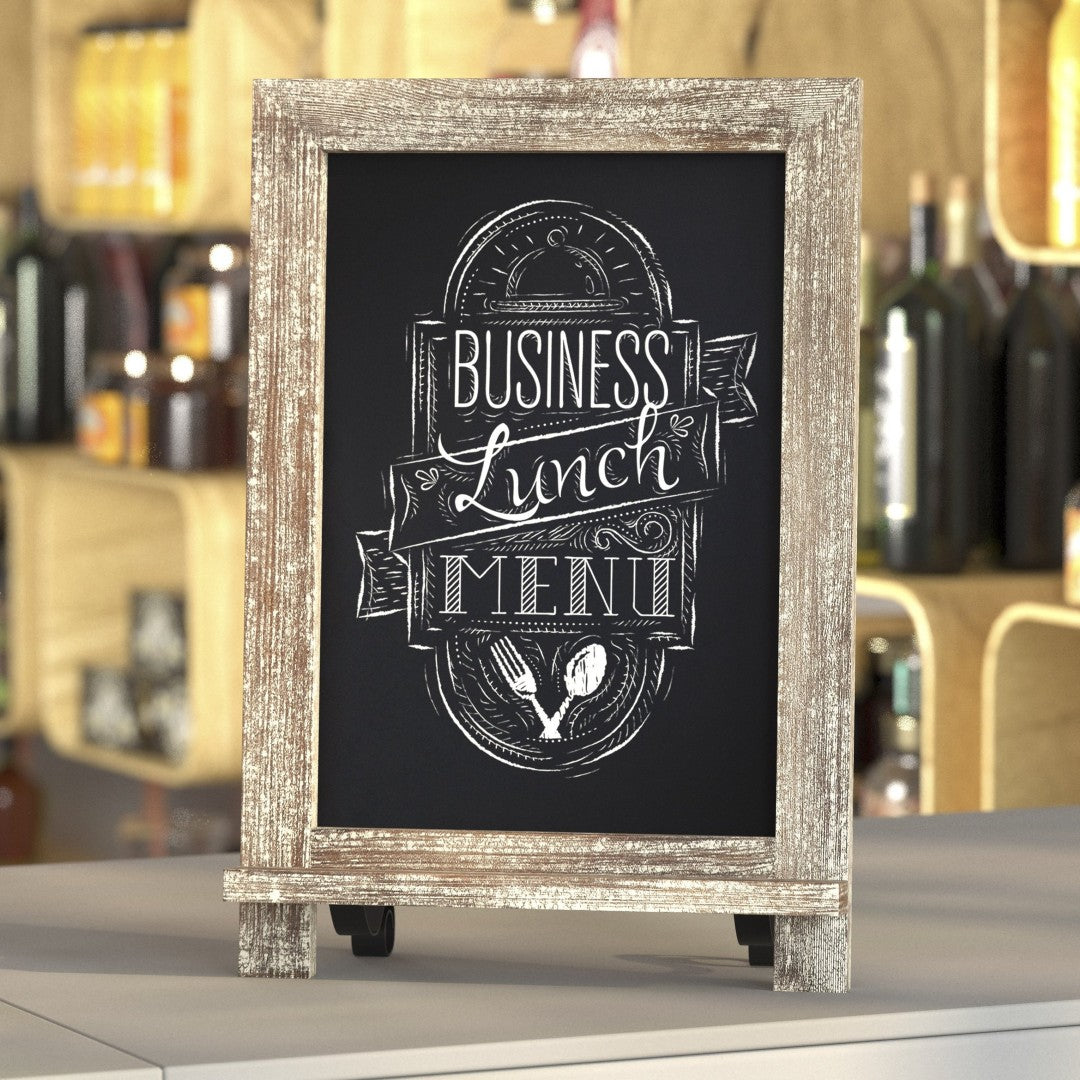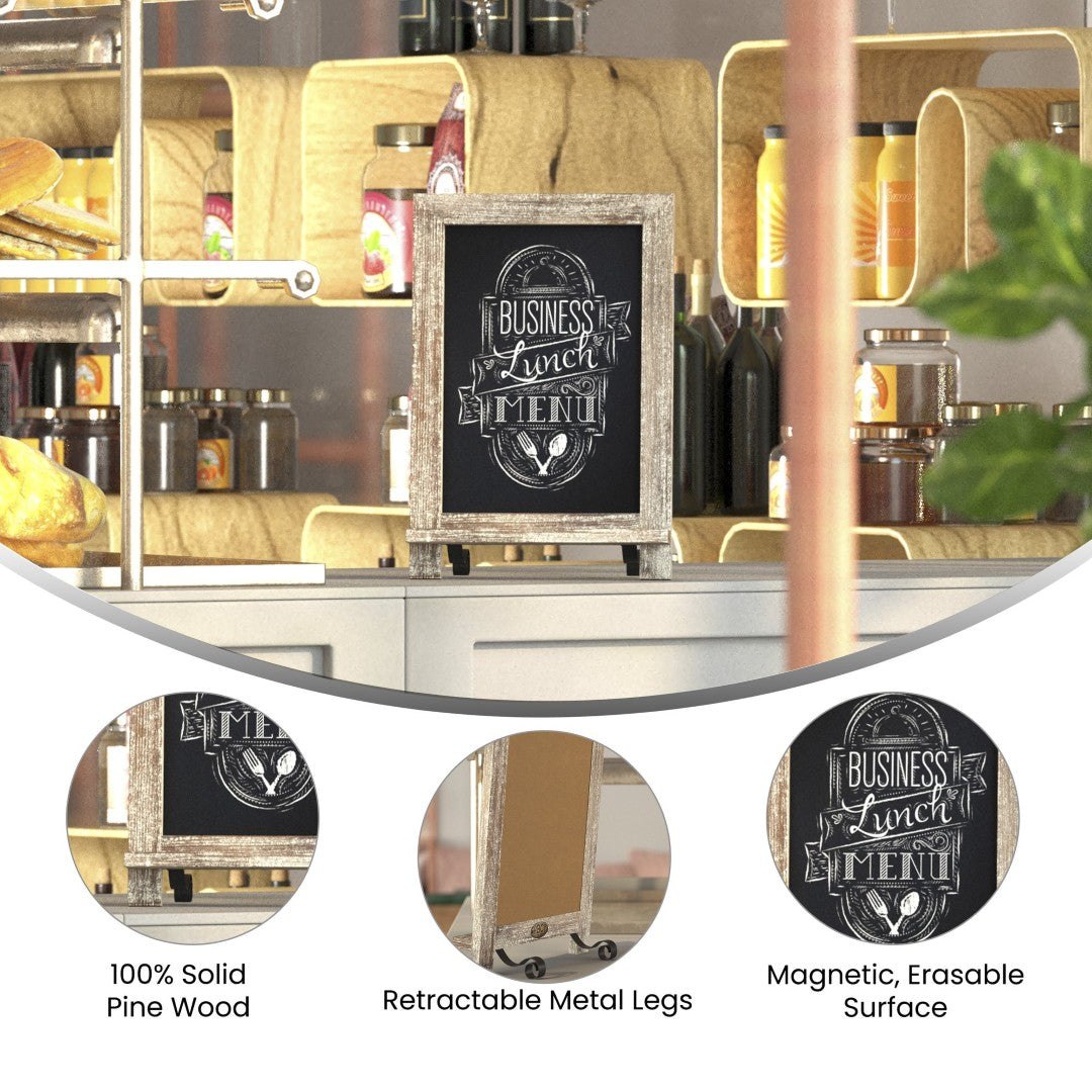 Keep your home or business organized with this elegant set of 10 weathered tabletop chalkboards. Each board pairs a classic distressed pine frame with a durable, non-porous porcelain steel writing surface that works with liquid chalk markers or traditional chalk. Use them freestanding on counters and tables or fold the scrolled metal legs and hang them on the wall for a polished message center — perfect for menus, reminders, seating assignments, or event signage.