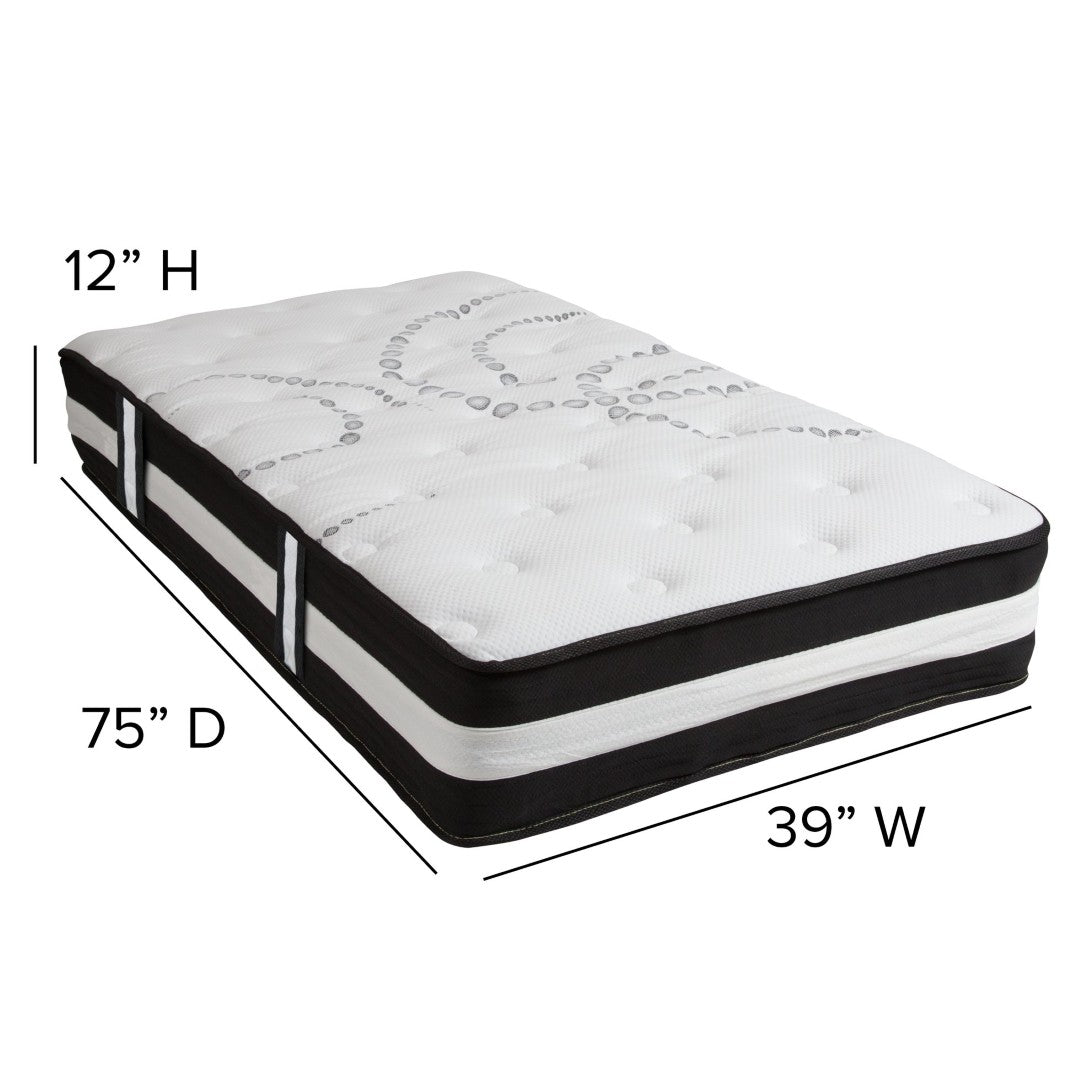 - Medium Firm 12" Twin Size Mattress: 39"W x 75"D x 12"H
