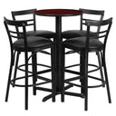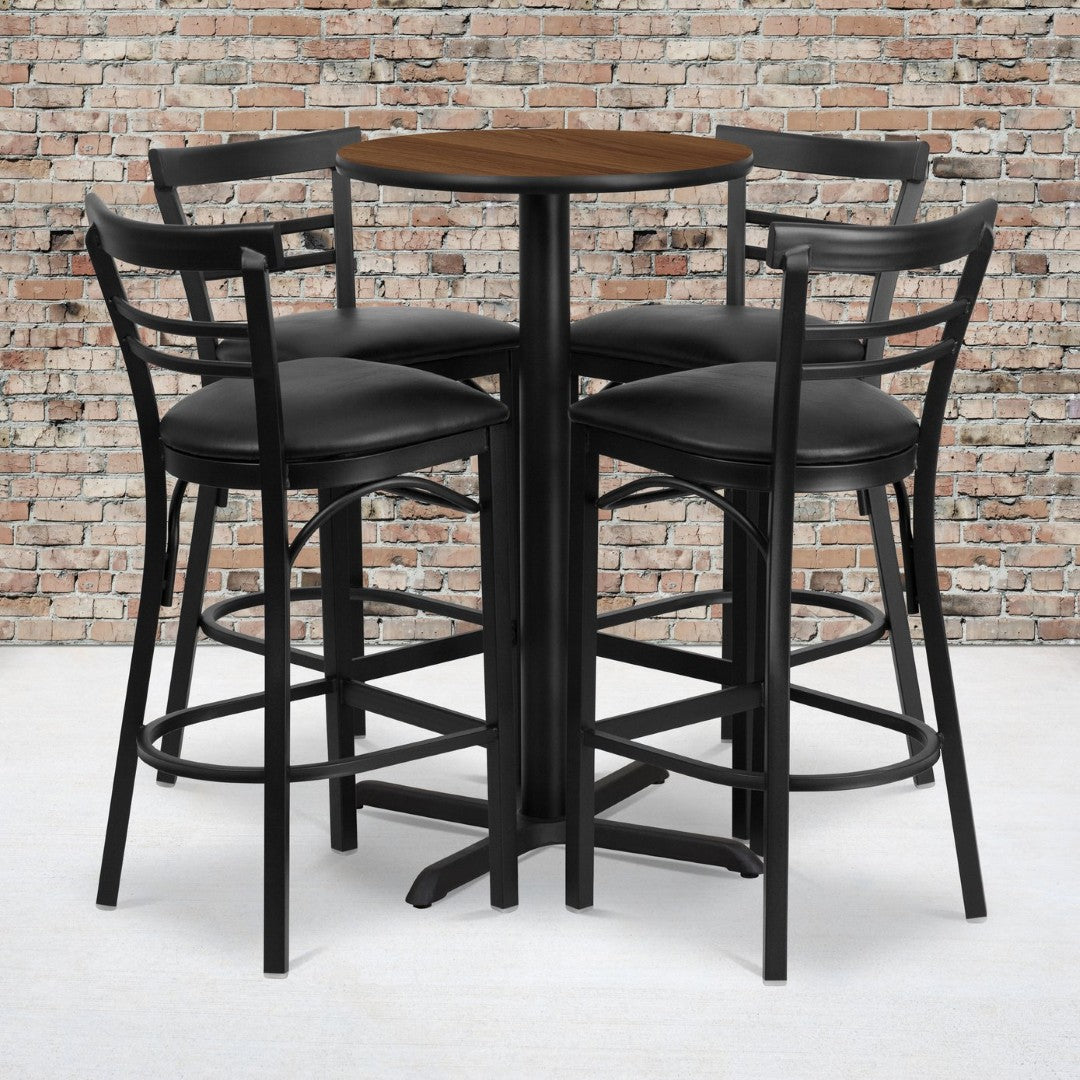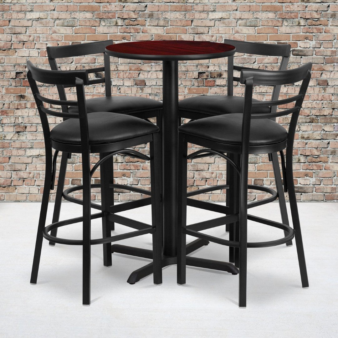- Complete Set: Includes one 24" round black laminate table with X-base and four two-slat ladder back metal barstools with black vinyl seats
