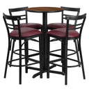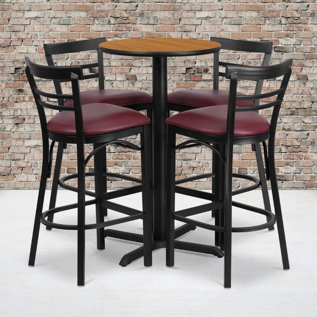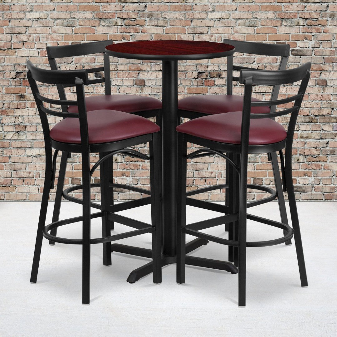 Give your dining or entertainment space a polished, professional look with this ready-to-use bar height table and stool set. Perfect for restaurants, bars, banquet halls, break rooms, or a stylish home game room, the set pairs a durable 24" round laminate tabletop and sturdy X-base with four comfortable two-slat ladder back metal barstools. Built for commercial use but refined enough for residential settings, the components resist heat, scratches, and moisture while offering easy cleaning and long-lasting performance.