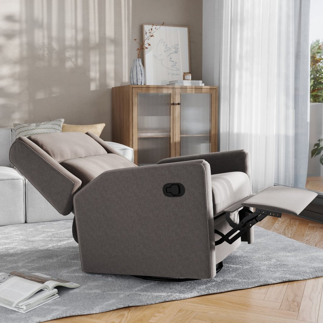 Sink into luxurious comfort with this versatile 3-in-1 manual recliner that functions as a recliner, rocker/glider, and full 360° swivel chair. Ideal for living rooms, bedrooms, or nurseries, it offers plush seating, durable performance, and easy care so you can relax, read, nurse, or watch TV with confidence. The upholstery is water-repellent, stain-resistant, and flame retardant for worry-free everyday use, and assembly is fast so you’ll be enjoying it in minutes.
