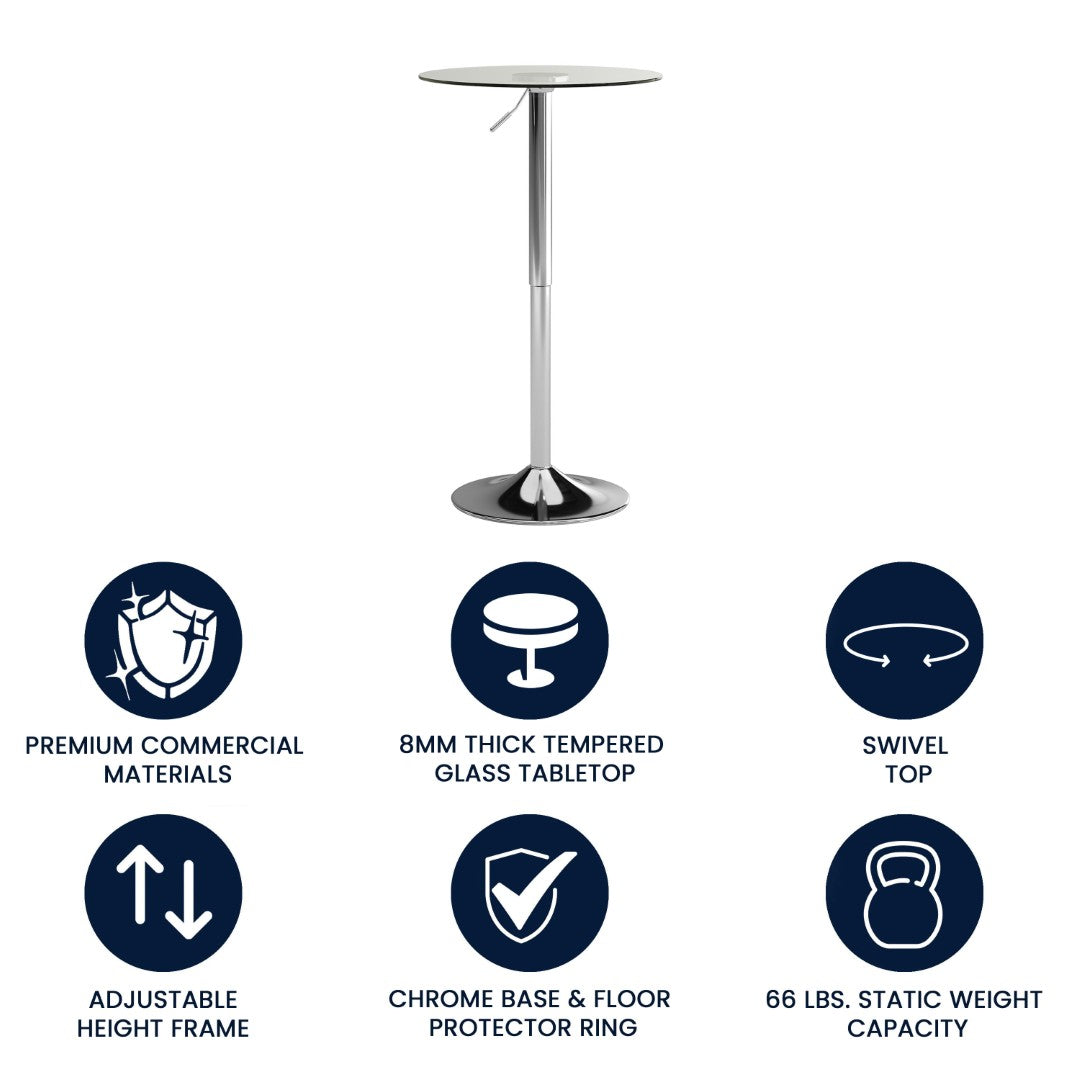 This elegant round glass table combines contemporary style with commercial-grade functionality, making it an ideal choice for restaurants, event venues, or modern home entertaining. Sleek chrome accents and a clear tempered glass top create a light, open look while practical features — like a swivel surface and pneumatic height adjustment — let you tailor the table to any setting, from cocktail gatherings to counter-height service.