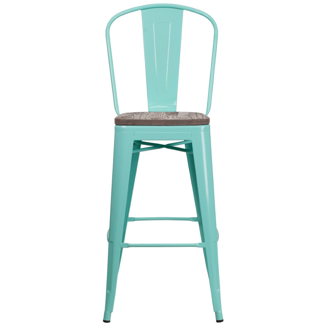 Give your dining area or bar a refreshing rustic-meets-industrial update with this high-back bistro-style barstool. Crafted from sturdy iron with a textured walnut elm wood seat, its curved back and clean vertical slat deliver classic bistro character while the powder-coated finish in crystal teal-blue adds a modern, eye-catching pop of color. Built for both commercial and residential settings, this stool balances durability, comfort, and style for restaurant dining rooms, home bars, or kitchen islands.