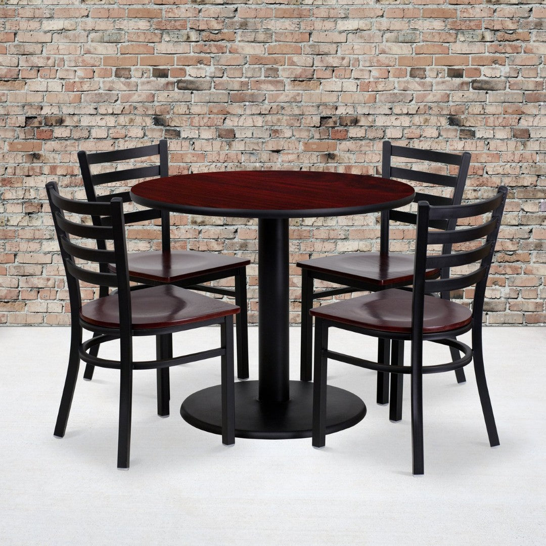 - Complete set includes: one 36" round table with base and four ladder-back metal chairs with mahogany wood seats