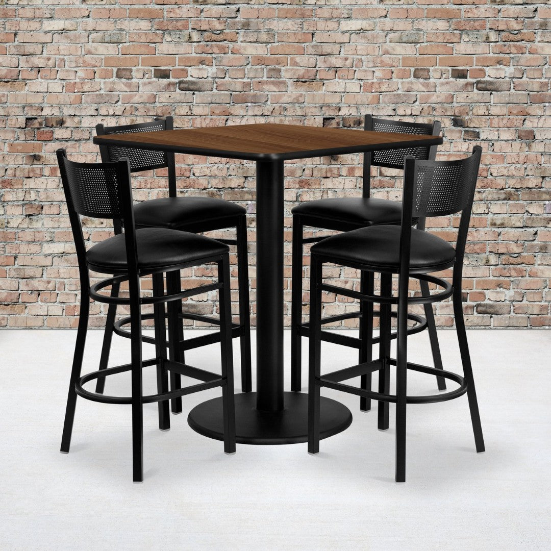 - Included: 1 square bar-height table and 4 grid-back metal barstools with black vinyl seats.