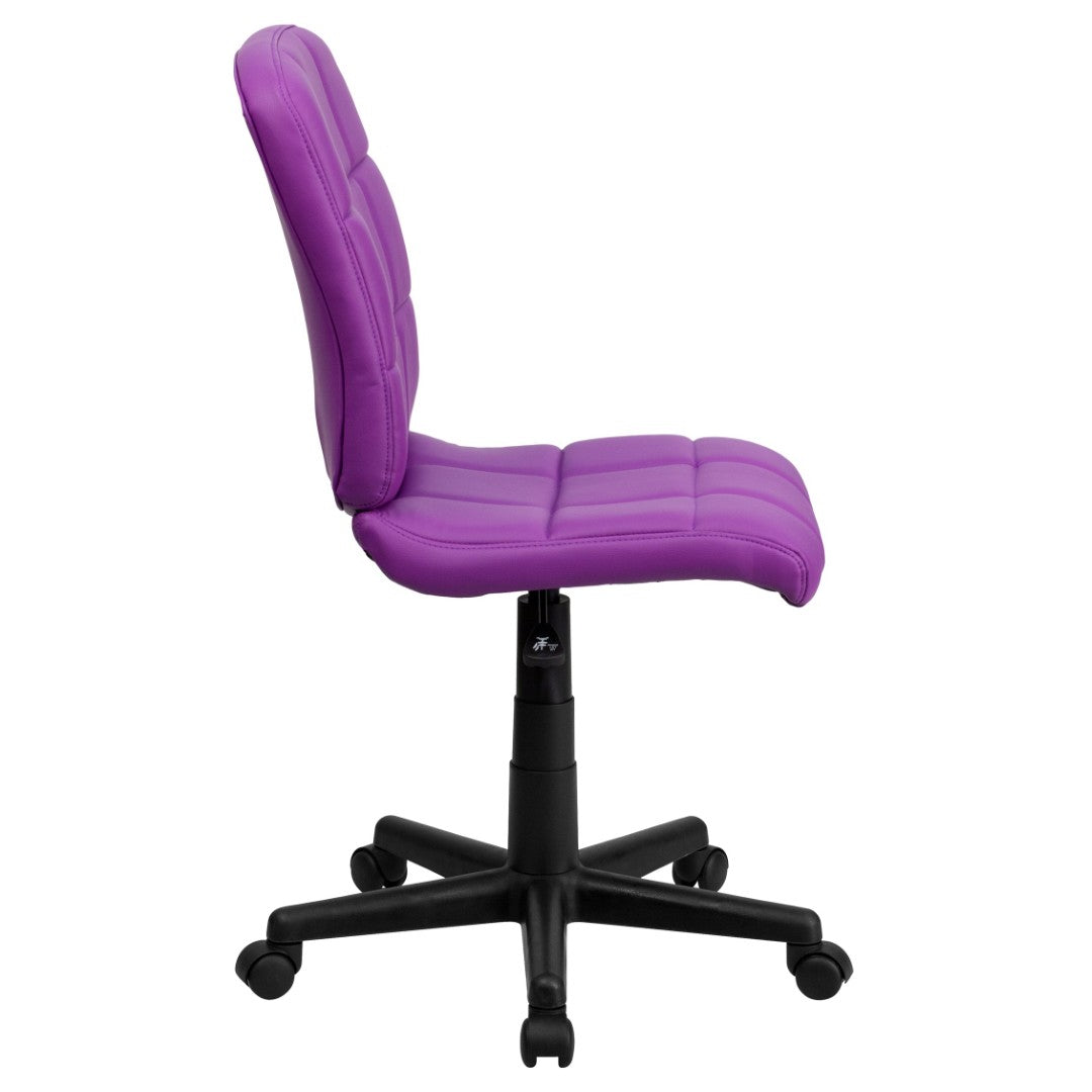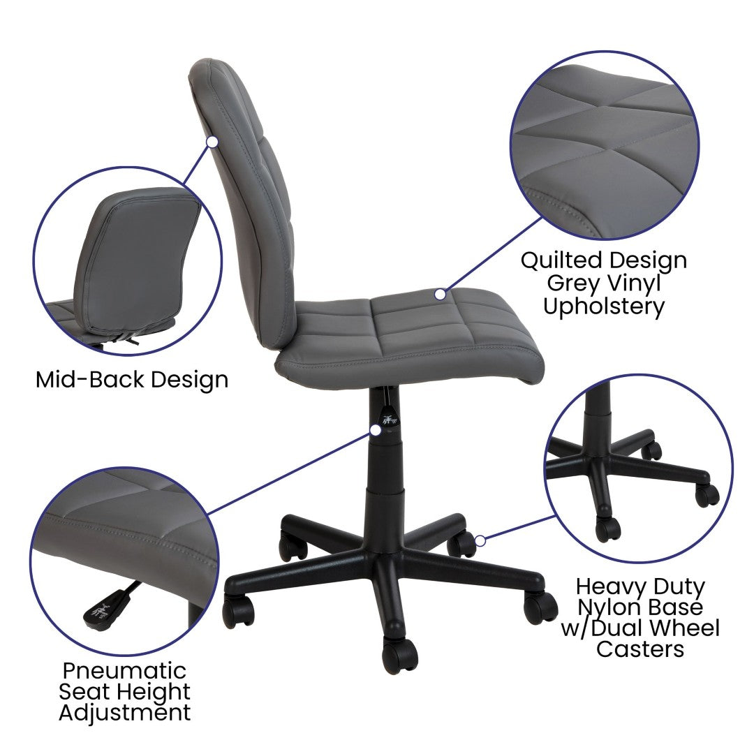 Update your office with refined comfort and a streamlined silhouette. This armless mid-back swivel task chair combines quilted, tufted vinyl upholstery with ergonomic details—like a waterfall seat edge and cushioned foam—to support long hours at a desk while maintaining a compact footprint ideal for conference rooms, reception areas, and home offices.