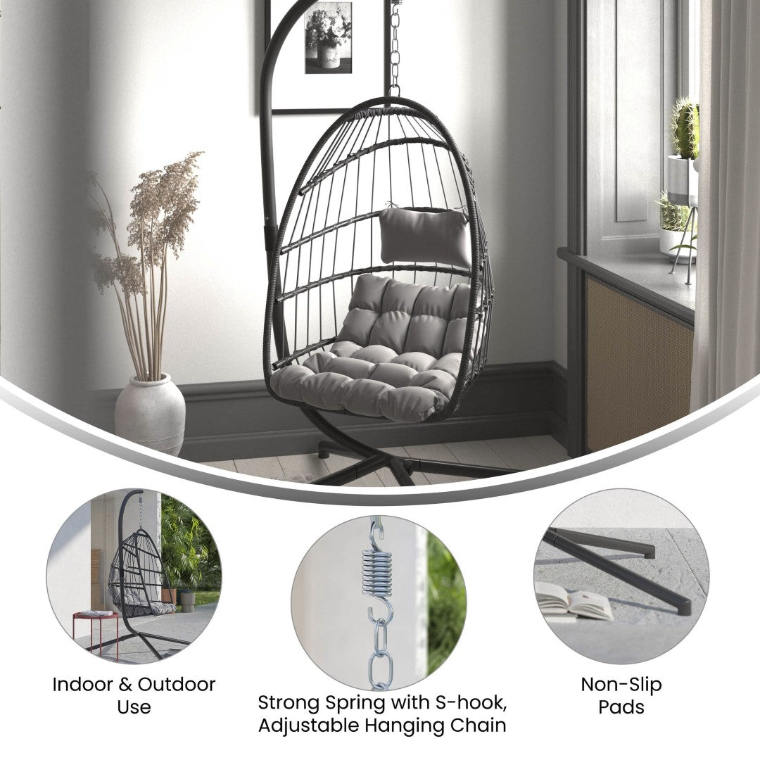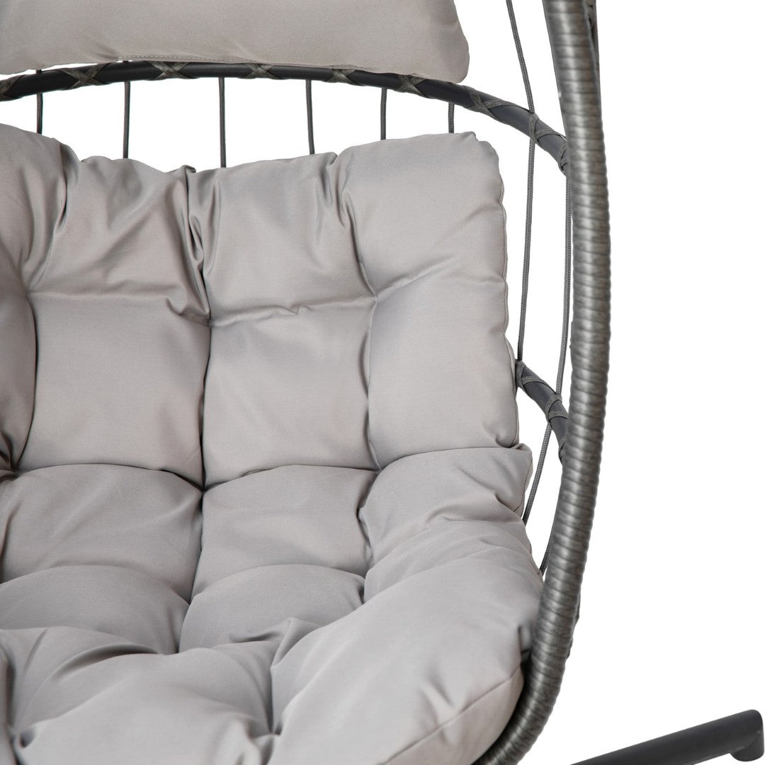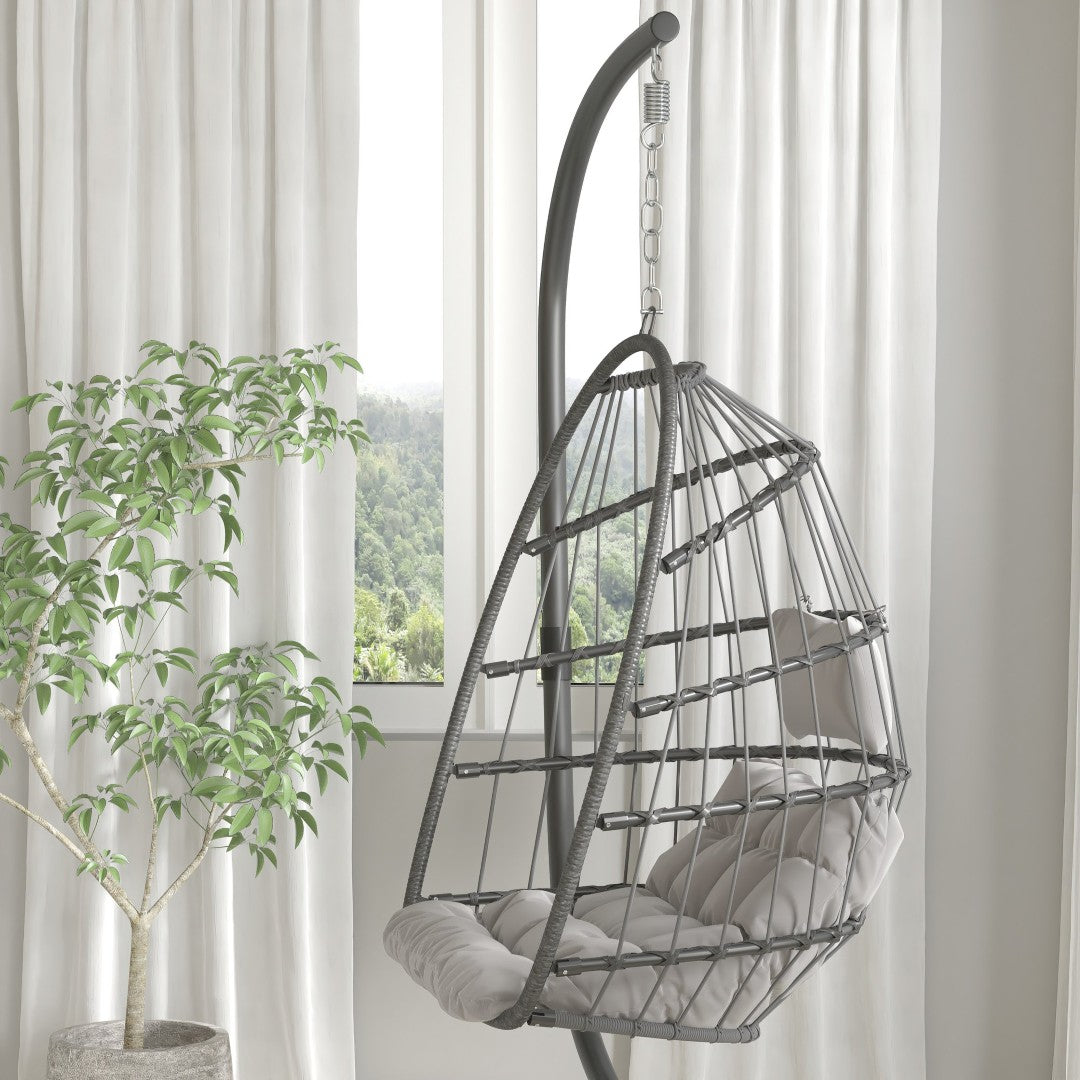 Relax in stylish comfort with this boho-inspired hanging egg chair — designed to be a focal point whether placed on a balcony, patio, or in a living room. The roomy woven basket, plush cushions, and included C-style stand create a cozy, no-ceiling-installation solution that combines weather-resistant construction with a refined, upmarket look. Easy to assemble and low maintenance, it’s ideal for renters or anyone wanting a portable, comfortable retreat.
