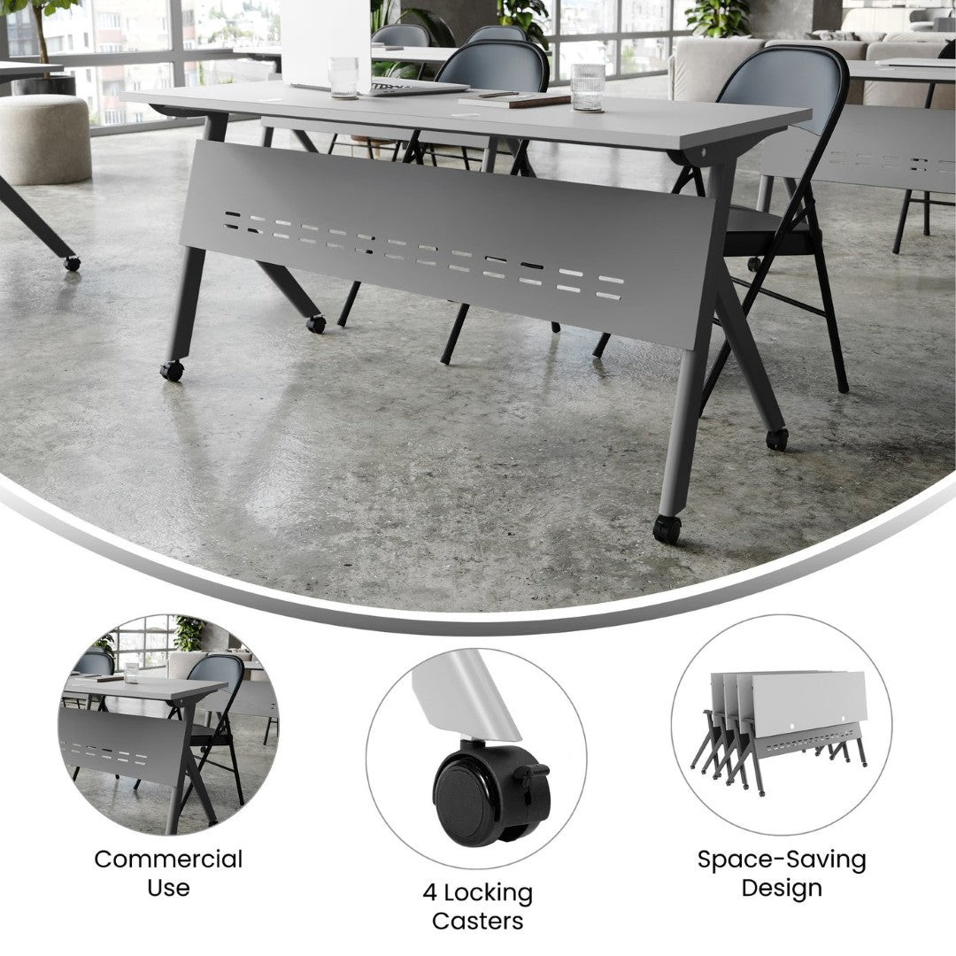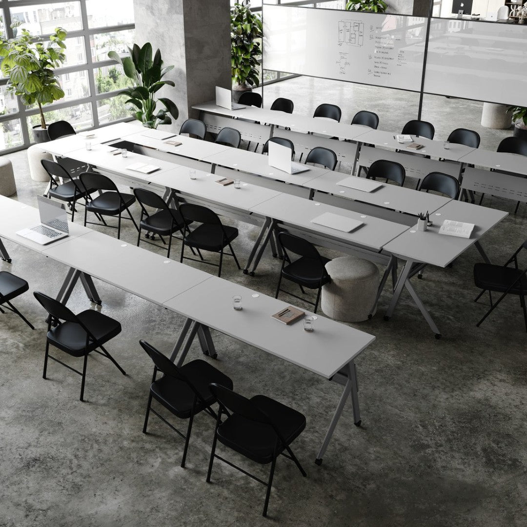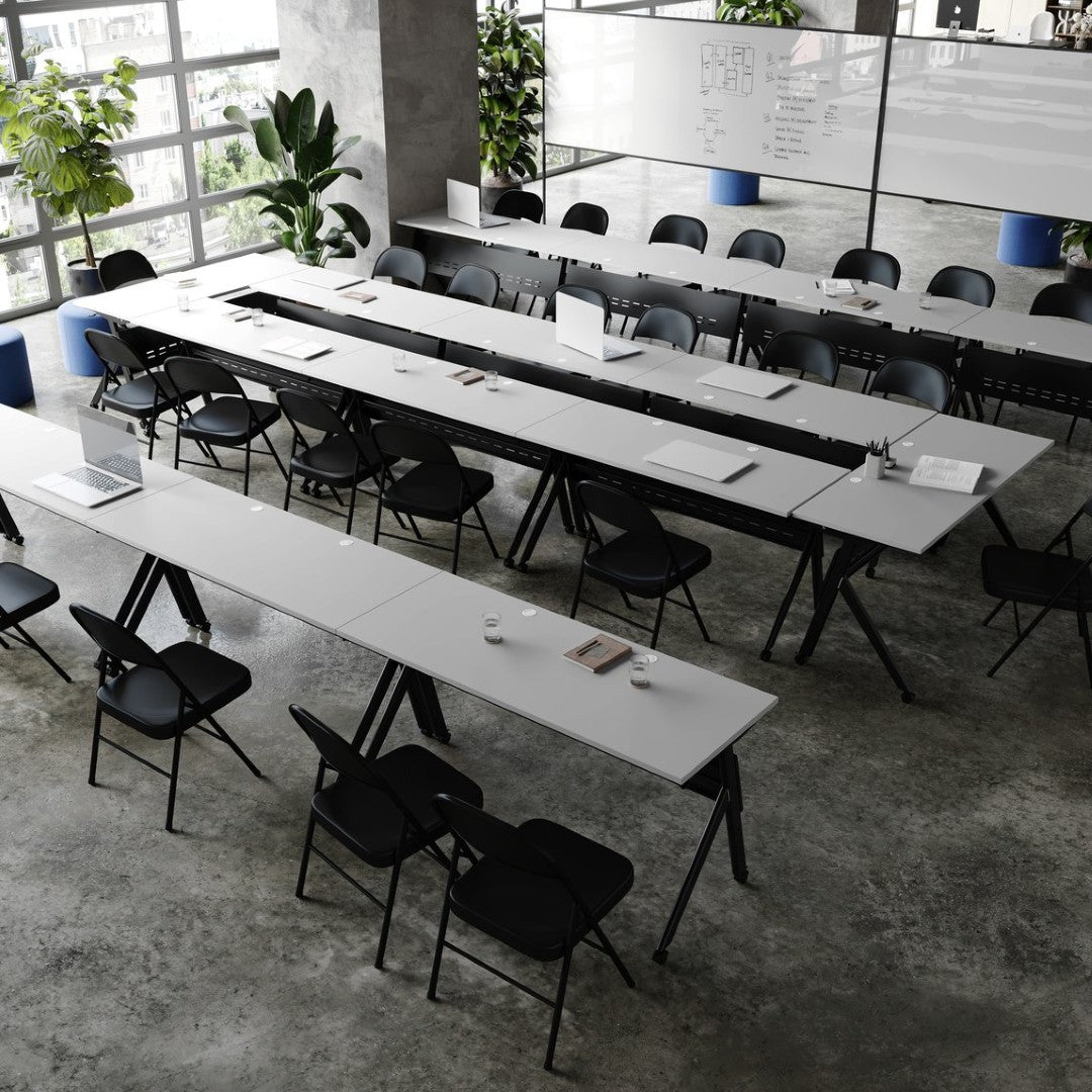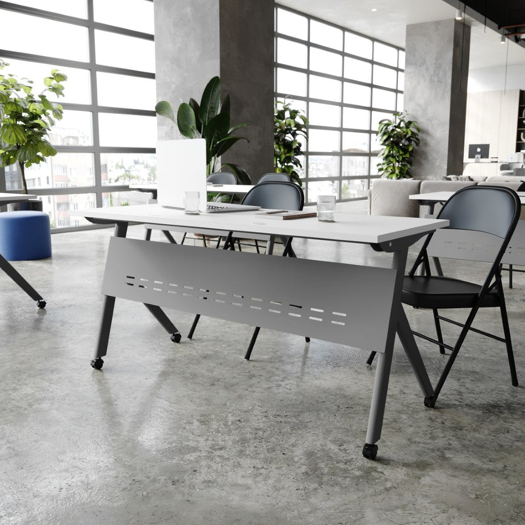 Combine durable construction with smart space-saving design in a professional training table built for frequent commercial use. Ideal for classrooms, offices, libraries, computer labs, and home-school setups, this heavy-duty flip training table offers comfortable seating for two adults, integrated cable management, a privacy modesty panel, and easy nesting for compact storage — all on a sturdy steel frame rated for heavy use.