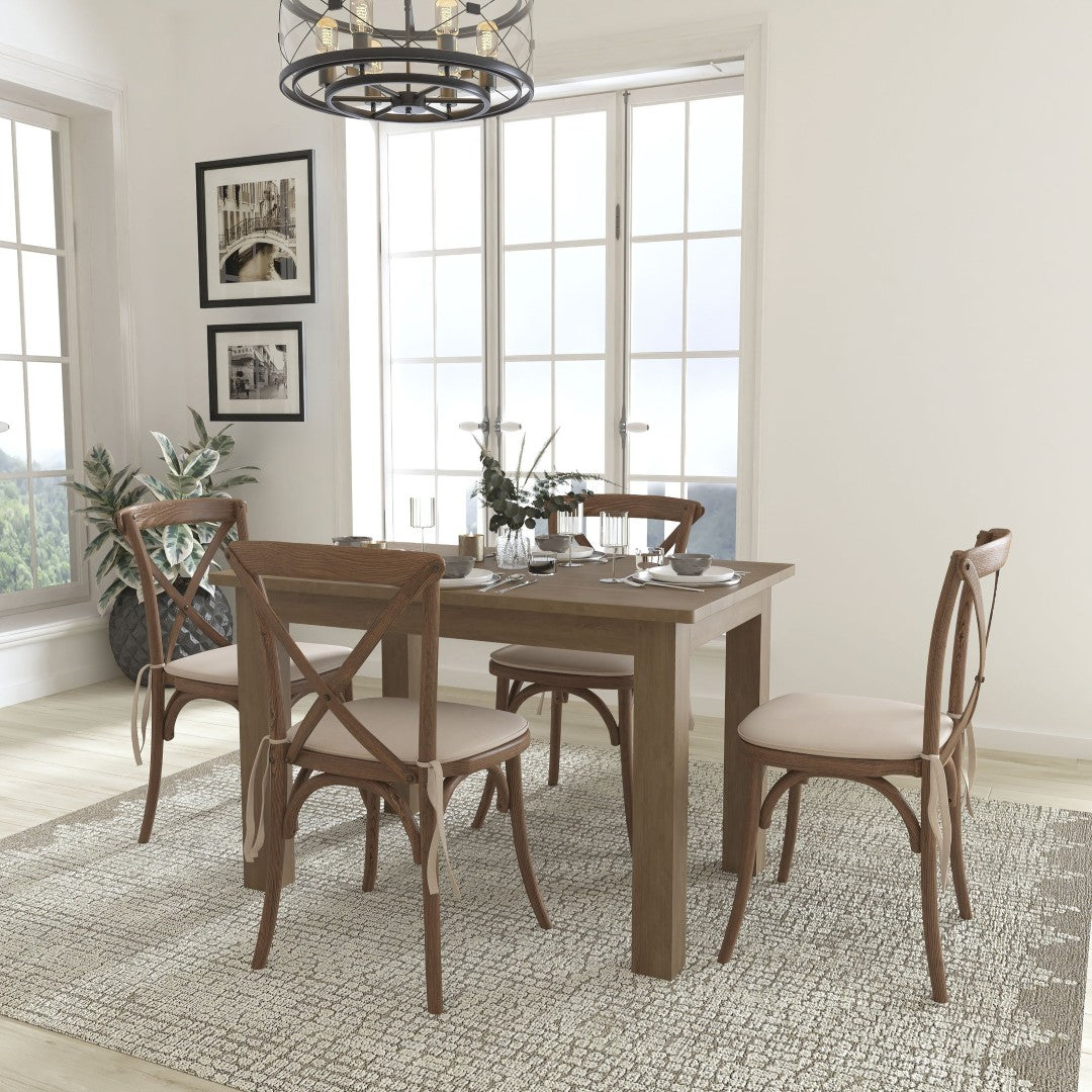 Invite friends and family to gather around a timeless farmhouse centerpiece that blends rustic charm with commercial-grade durability. This Antique Rustic Farm Table Set pairs a solid pine plank-top table with four stackable cross-back chairs upholstered with comfortable 1" natural cushions — an ideal choice for kitchens, dining rooms, cafes, or event settings where warm, country-modern style meets everyday functionality.