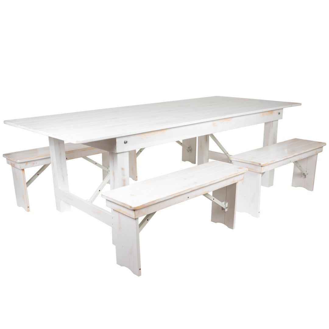 Bring classic farmhouse charm to your dining space with this sturdy, foldable farm table and bench set — designed for both comfortable family meals and rugged commercial use. Crafted from solid pine with an antique rustic finish, the set combines a warm, plank-top aesthetic with practical folding hardware so you can easily transport or store it between events. Durable construction, reinforced aprons, and locking pins ensure stability whether used indoors daily or outdoors for occasional gatherings.