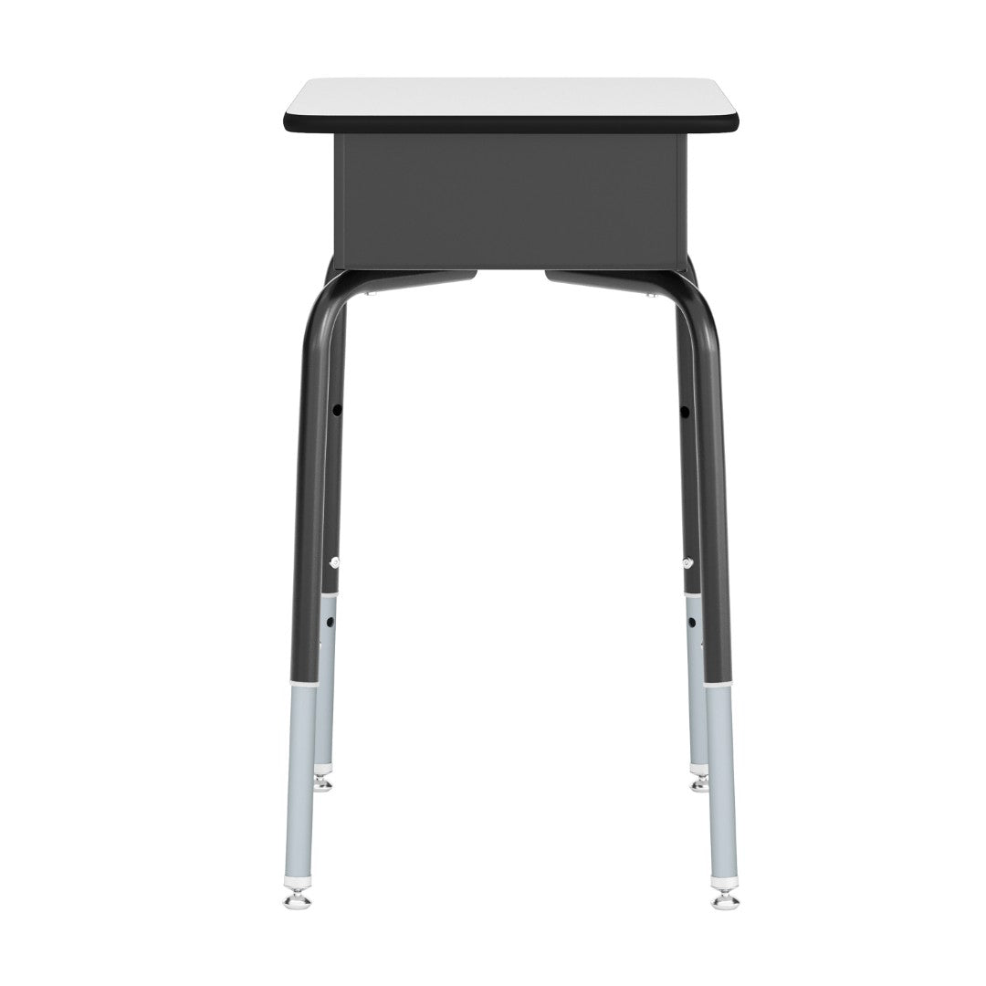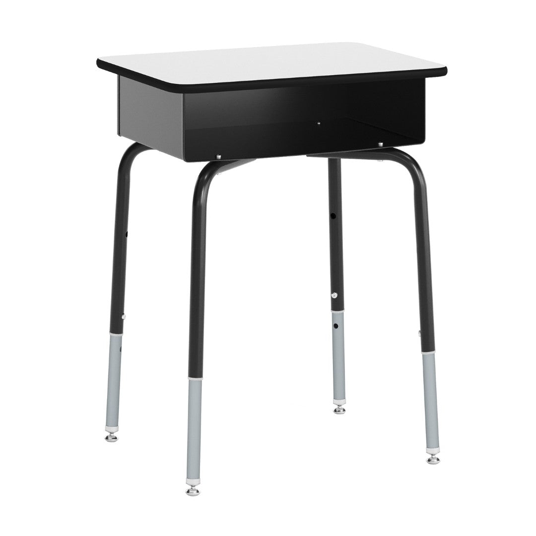 - Desk Has Laminate Top, Lacquer Edge Treatment, Height Adjustable Legs, and Metal Open Book Box
