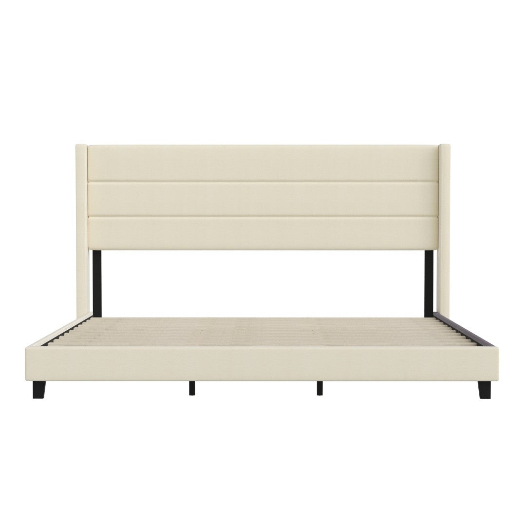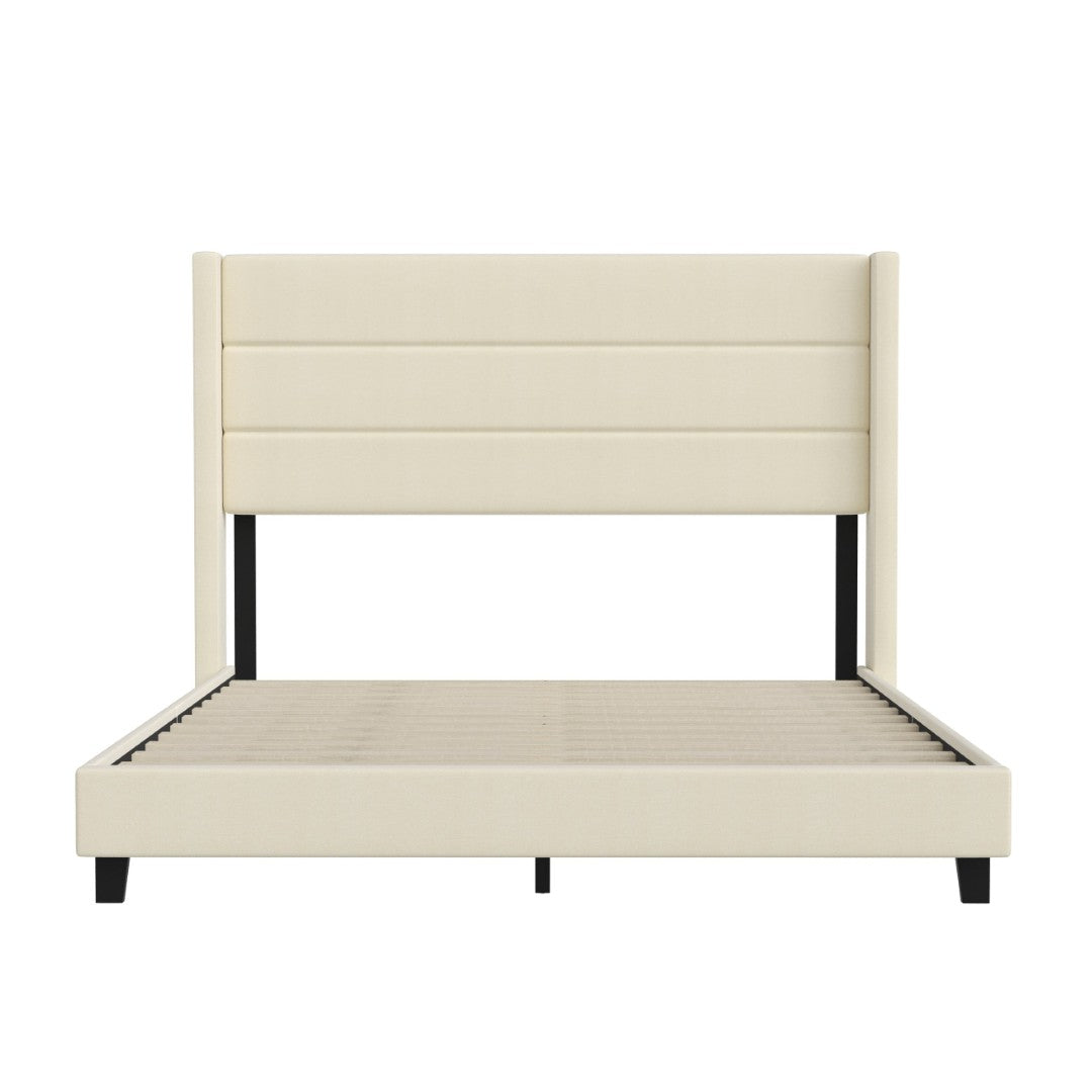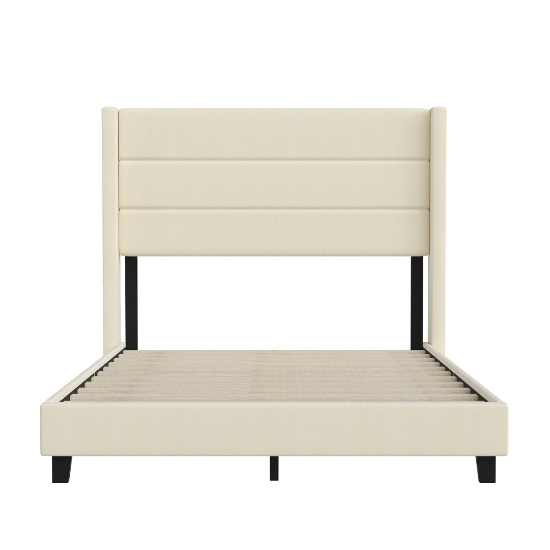 Transform your bedroom into a serene, contemporary retreat with this full upholstered platform bed. Soft beige faux linen wraps a wingback-style headboard and padded footboard for a refined look and comfortable backrest for reading or relaxing. Built with a lightweight yet robust engineered wood frame and wooden slats, the bed supports most mattress types without the need for a box spring, offers under-bed storage space, and assembles quickly with the included hardware.