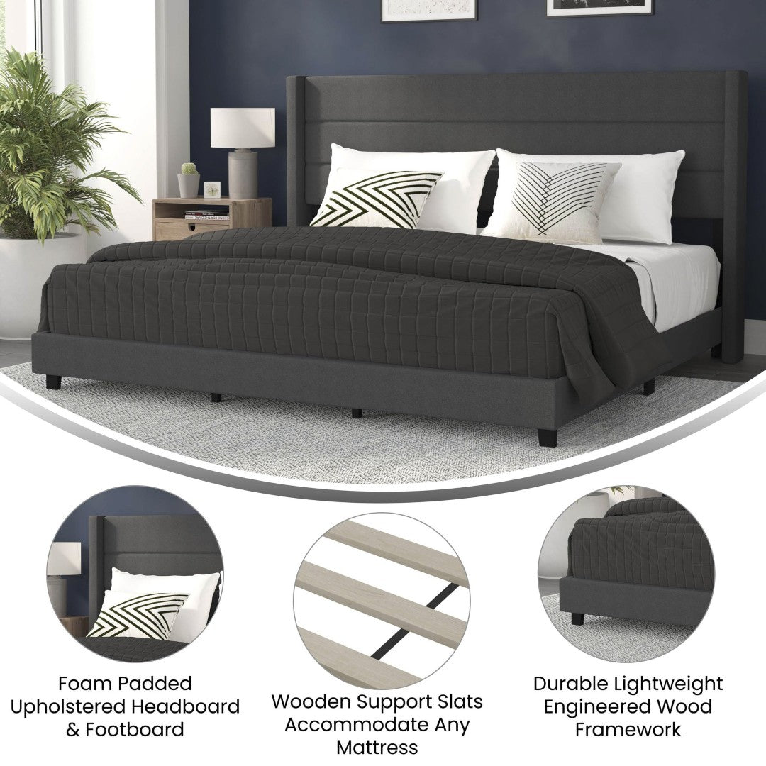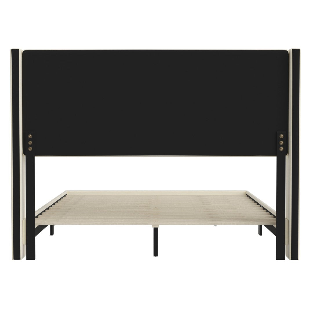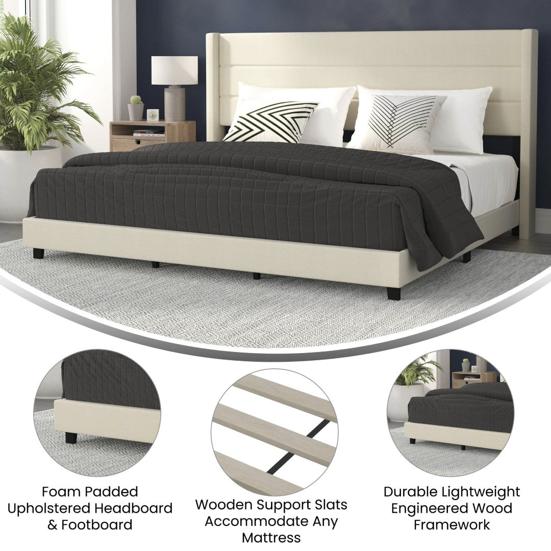 - Upholstery & Comfort: Beige faux linen upholstery with plush foam padding in the wingback headboard and footboard for added comfort and a tailored aesthetic.