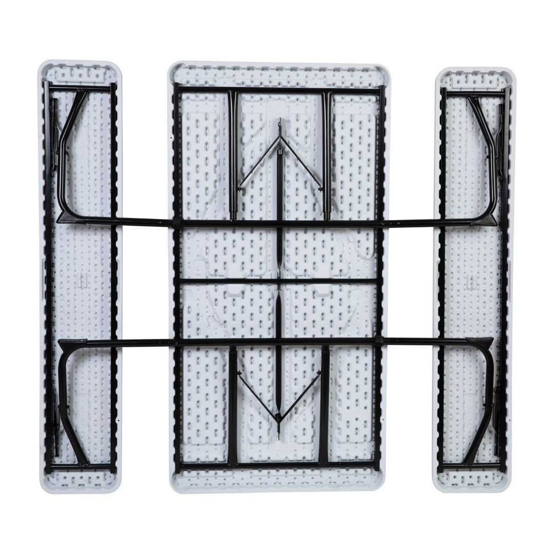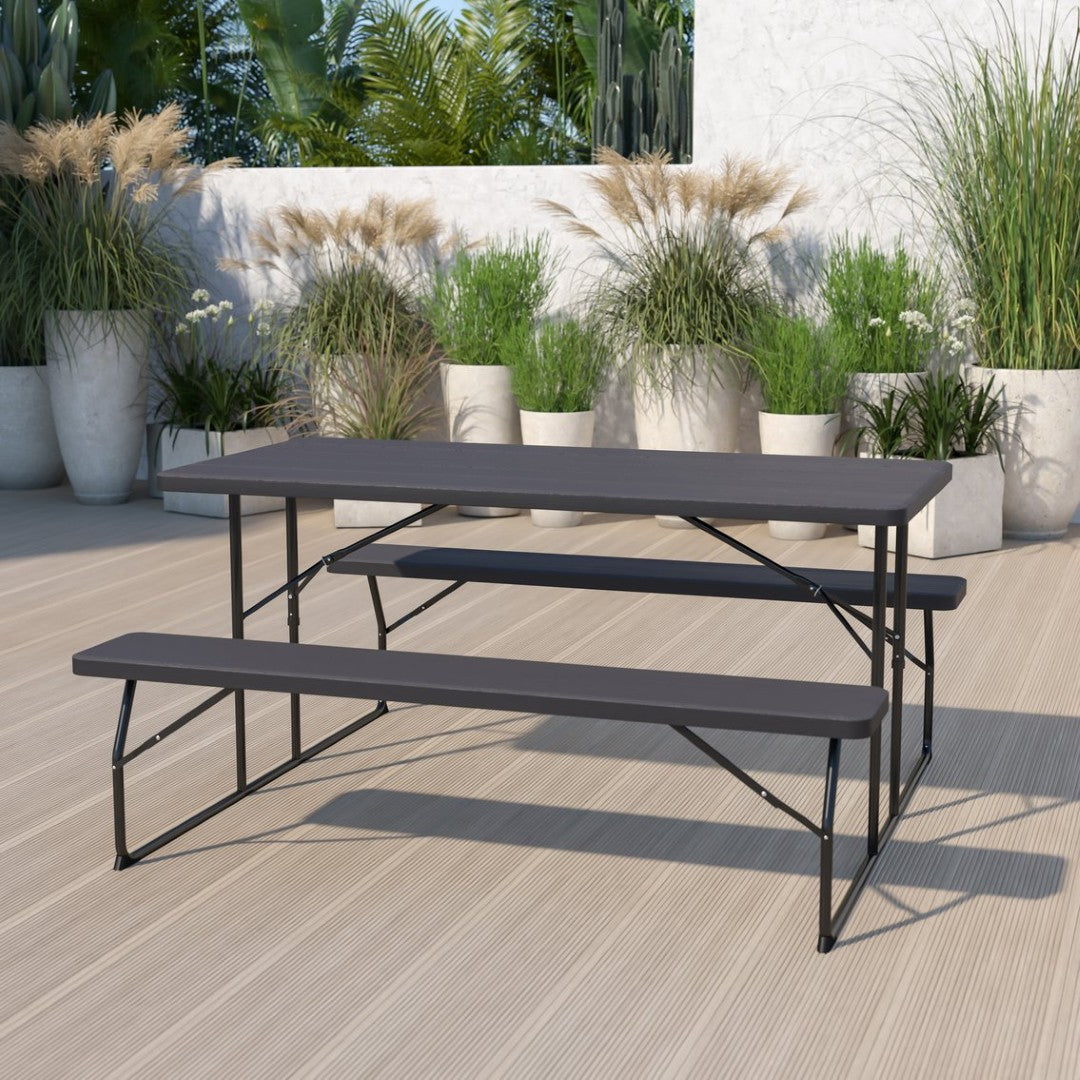 Enjoy effortless outdoor dining and gathering with this all-in-one folding picnic table and bench set. Designed for convenience, durability, and a refined wood-grain appearance, the Insta-Fold set is ideal for backyard meals, camping, tailgates, school campuses, or workplace break areas. It folds flat for compact storage, arrives fully assembled, and offers stable seating for four adults with easy-to-clean, weather-resistant surfaces.
