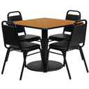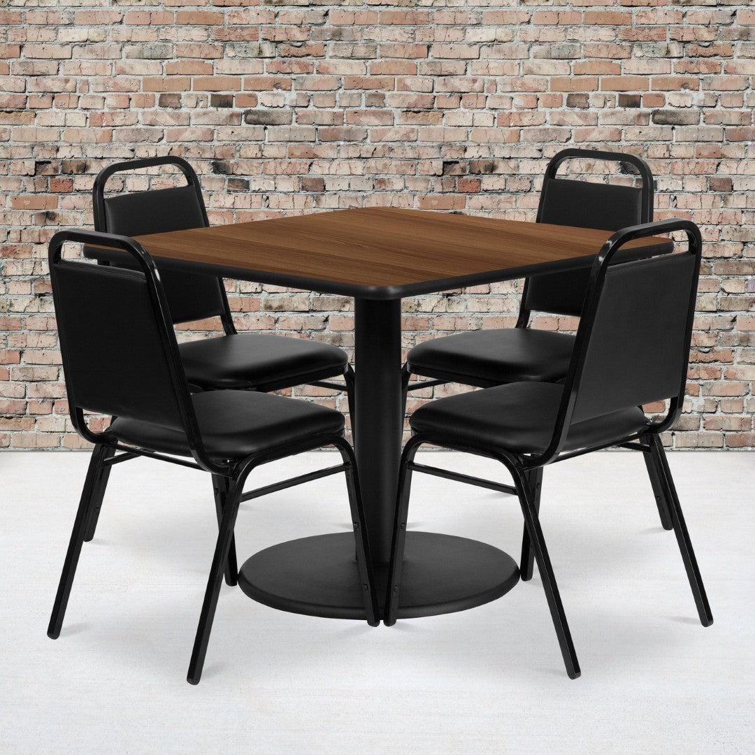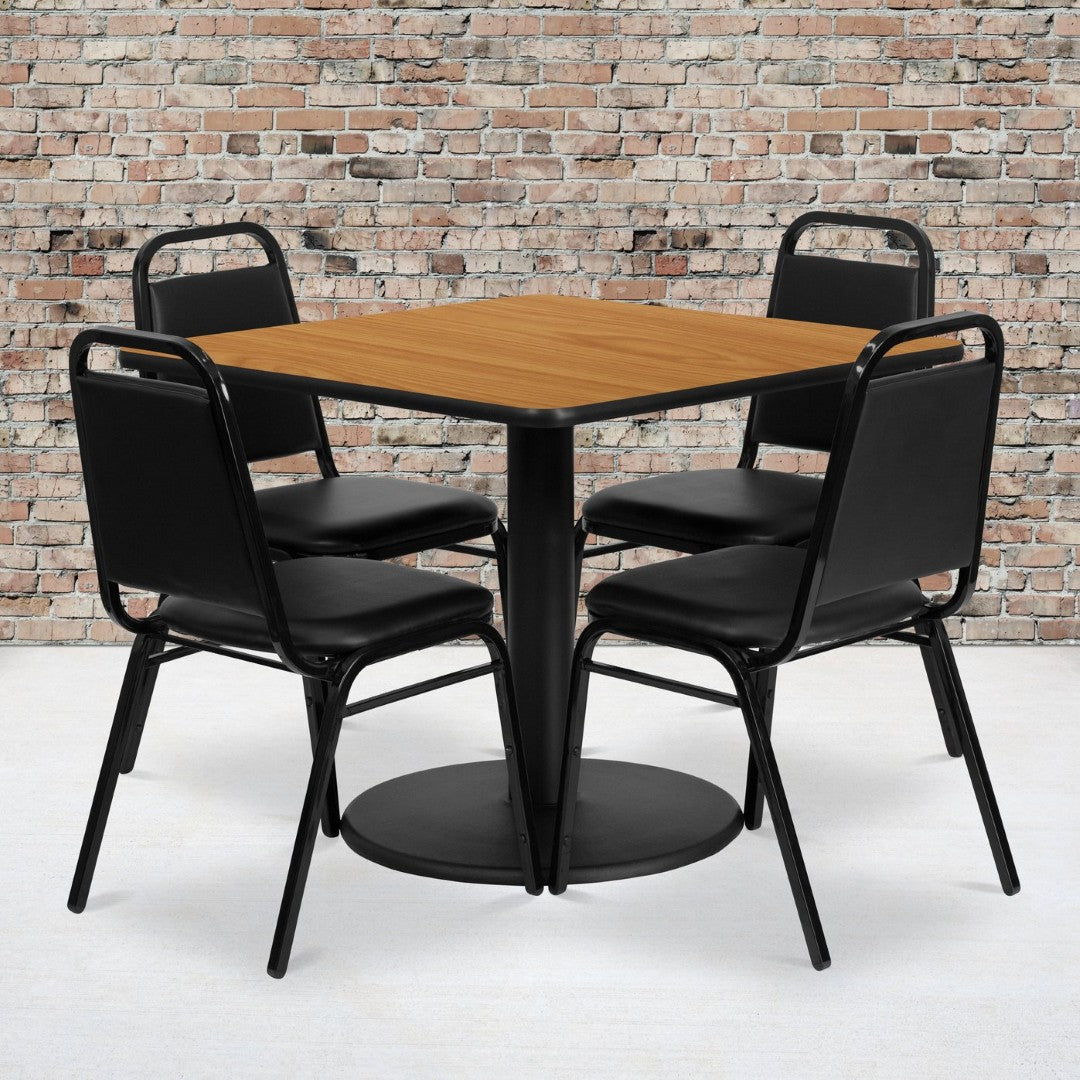 - Complete Set: Includes one 36" square table top with round base and four trapezoid-back banquet chairs