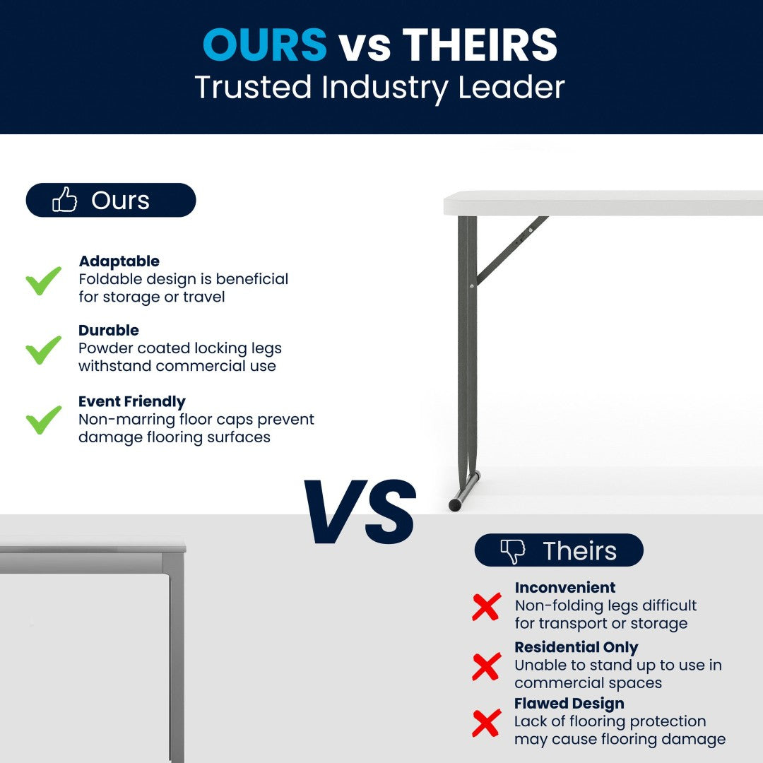 - Setup and Transport: No assembly required; legs lock underneath the tabletop for secure storage and easy carrying to meetings, conventions, or classrooms
