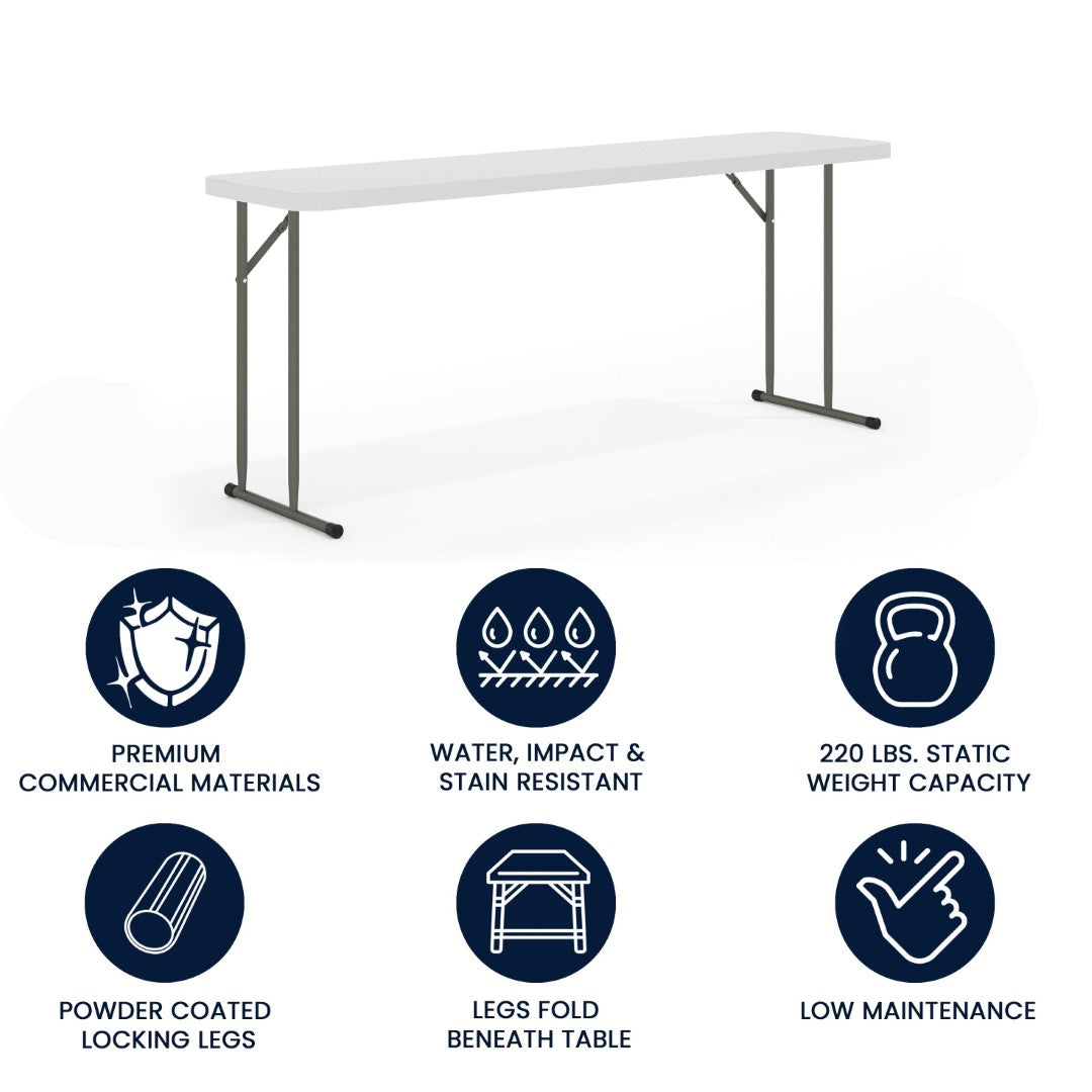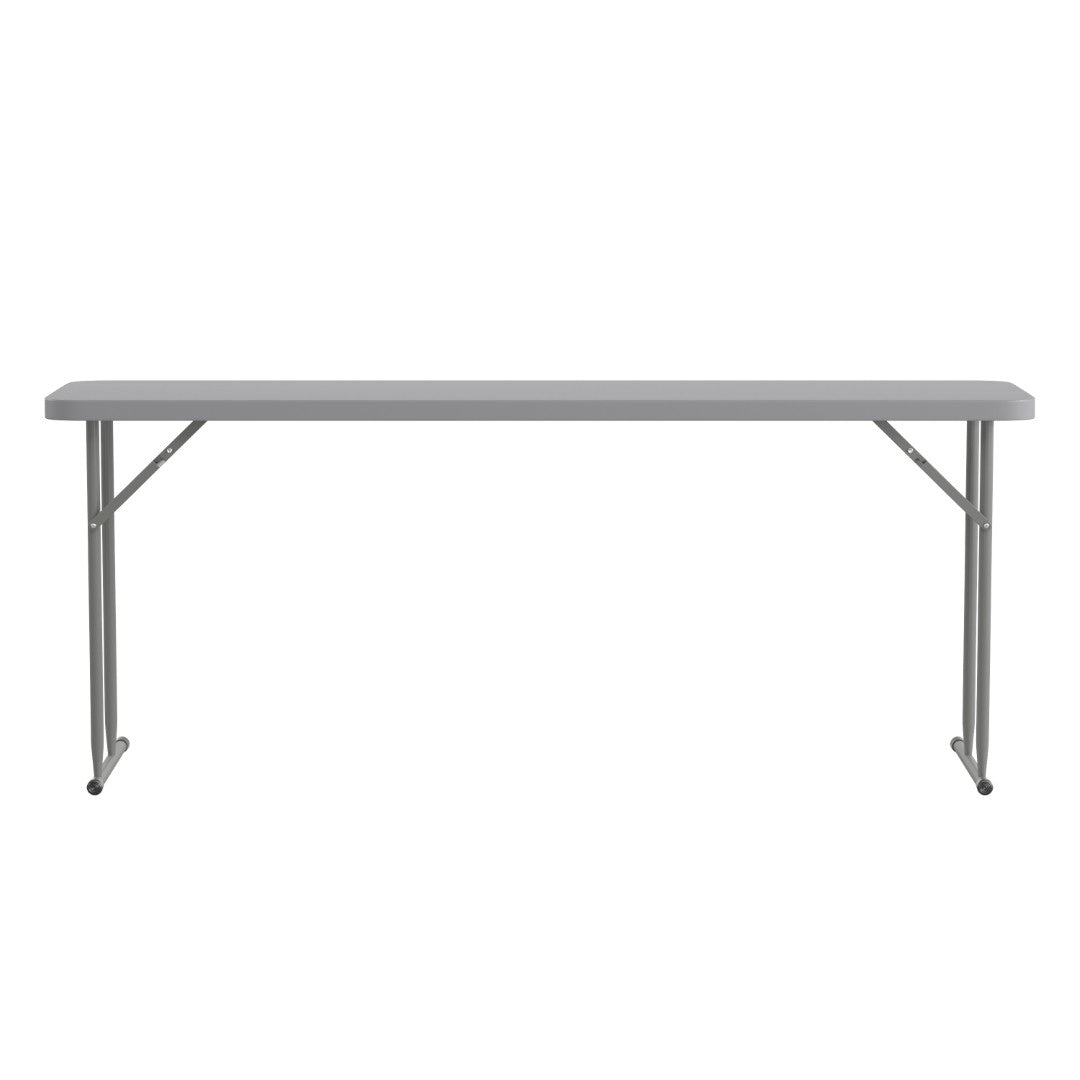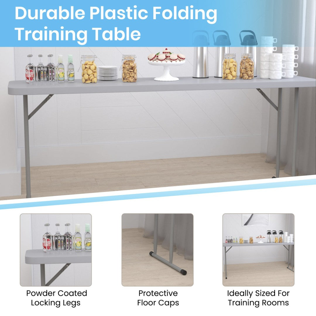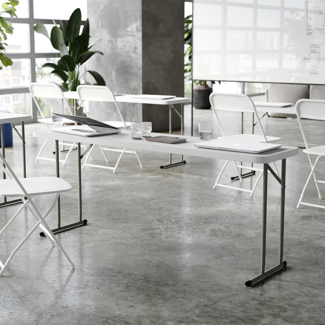 Perfect for classrooms, training centers, and event setups, this Kathryn 6‑foot folding training table combines durable construction with a space‑saving, easy‑to‑use design. Its narrow rectangular profile provides ample workspace for tests, informational packets, or laptops while allowing multiple tables to be arranged in compact rooms. Built to resist spills and daily wear, the table delivers reliable performance for training sessions, conventions, and multi‑use facilities.