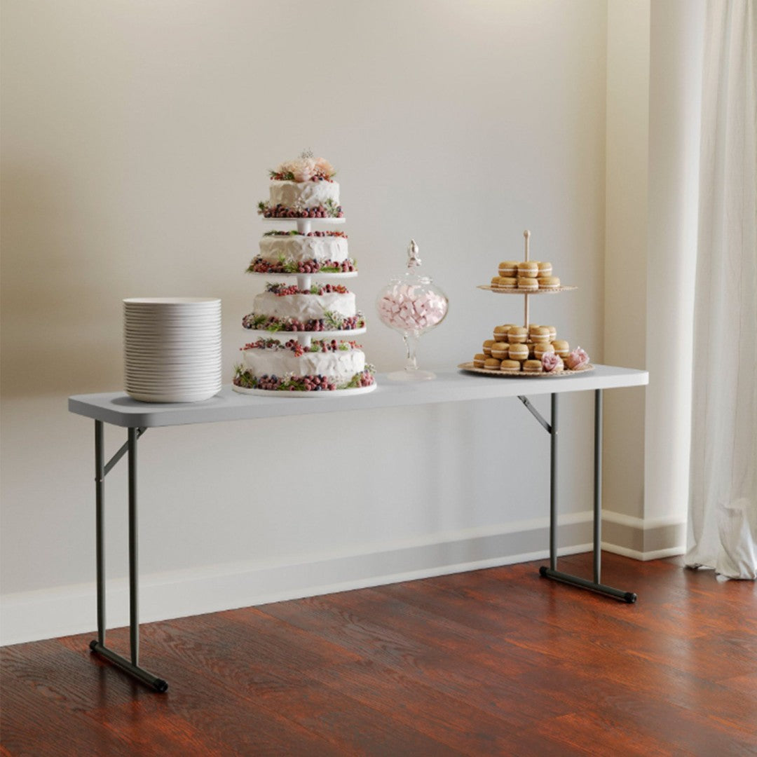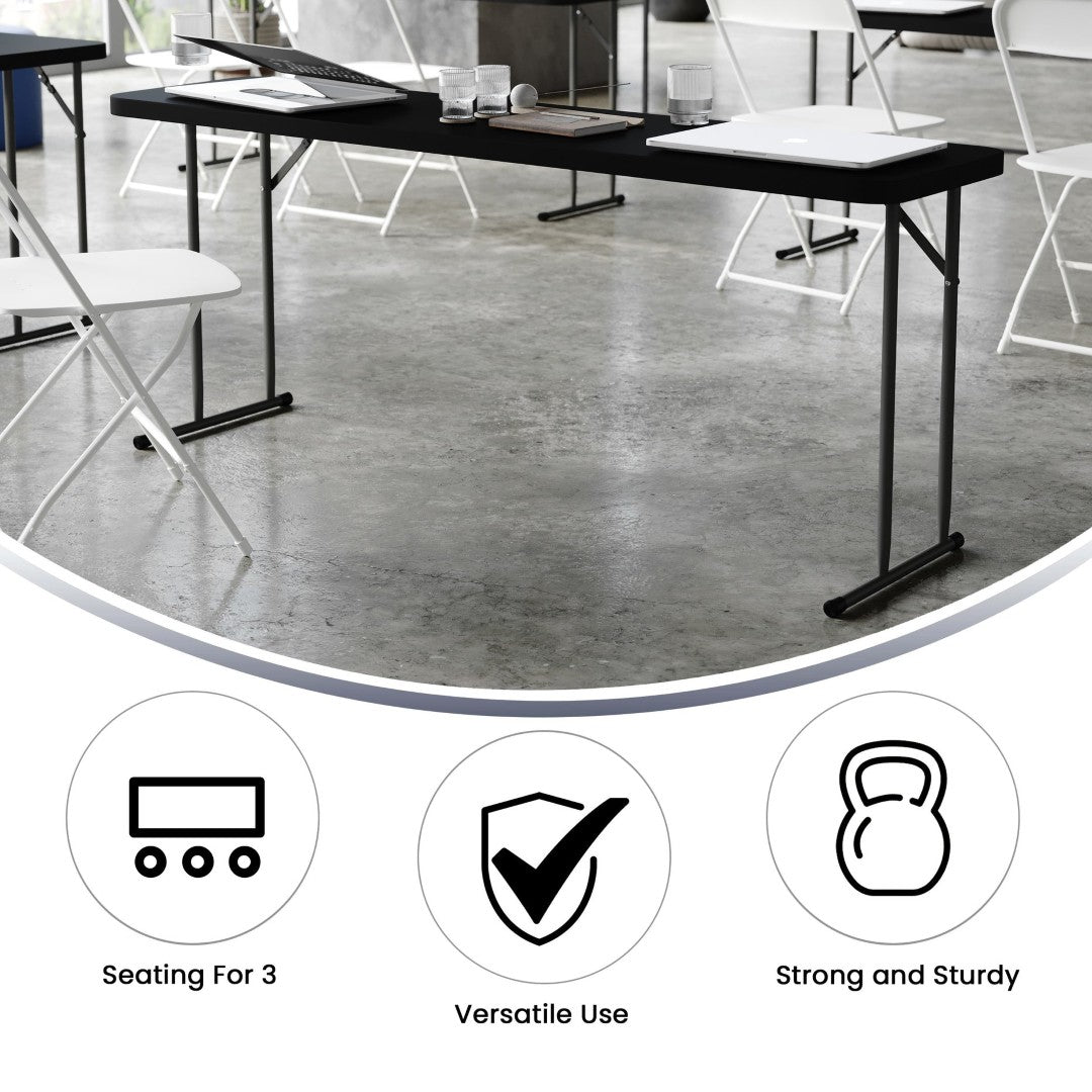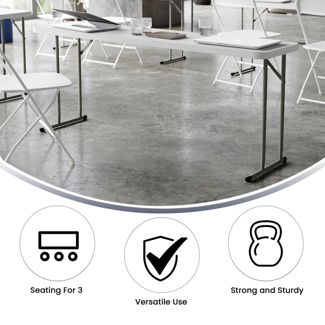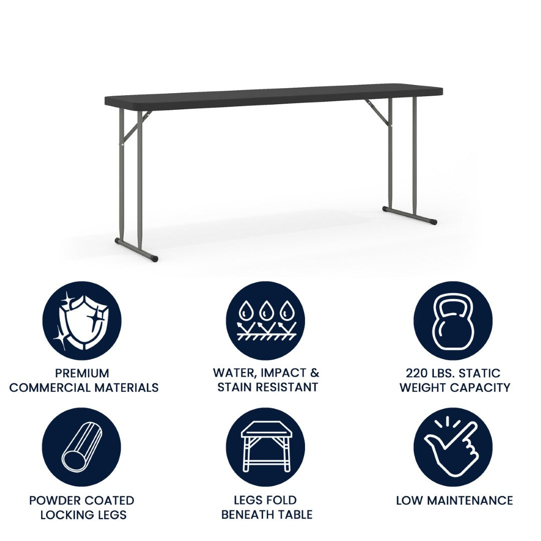 Perfect for classrooms, training centers, and event setups, this Kathryn 6‑foot folding training table combines durable construction with a space‑saving, easy‑to‑use design. Its narrow rectangular profile provides ample workspace for tests, informational packets, or laptops while allowing multiple tables to be arranged in compact rooms. Built to resist spills and daily wear, the table delivers reliable performance for training sessions, conventions, and multi‑use facilities.