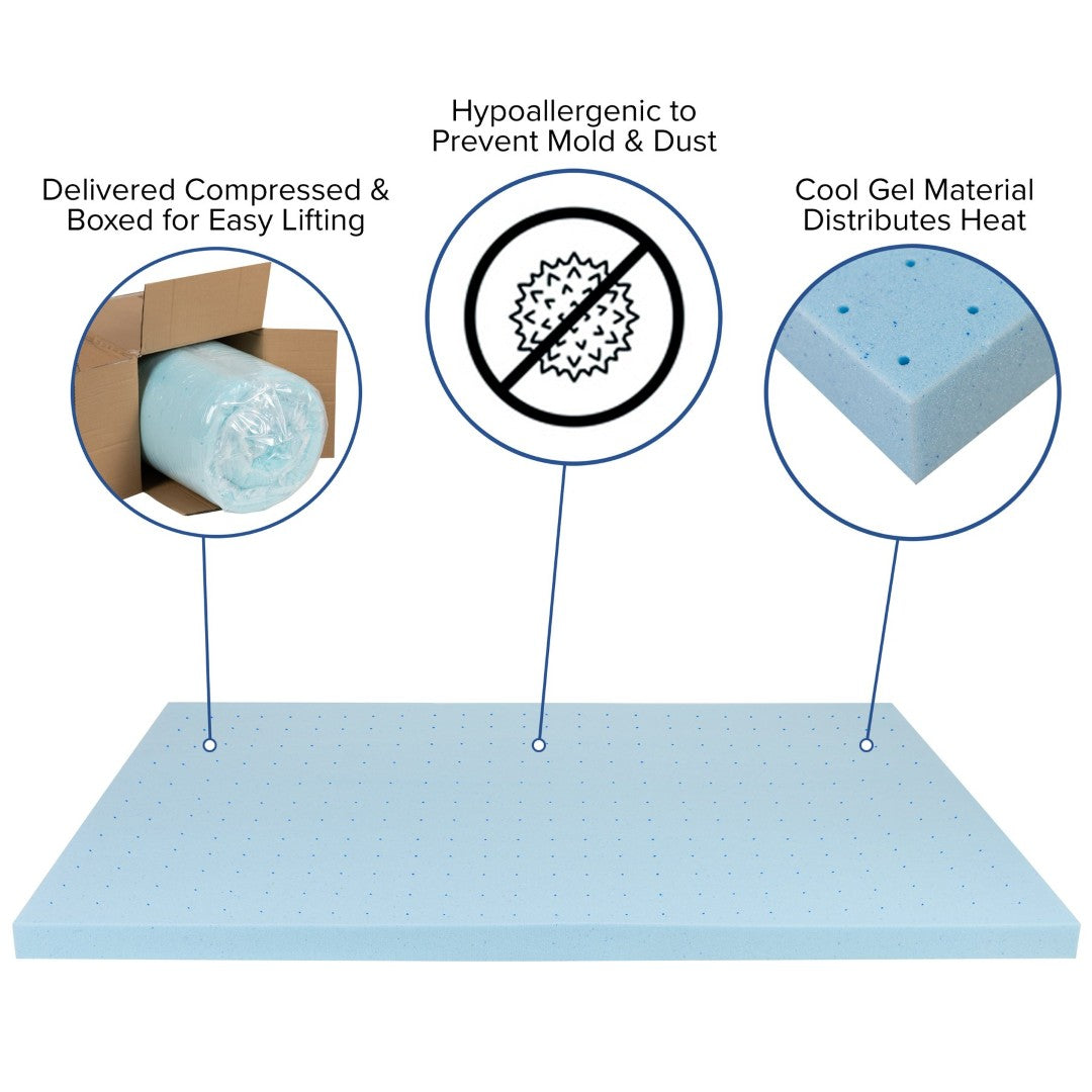 - Cooling 3" memory foam topper: Gel-infused, ventilated design disperses body heat and adds a pressure-relieving, cushioned comfort layer.
