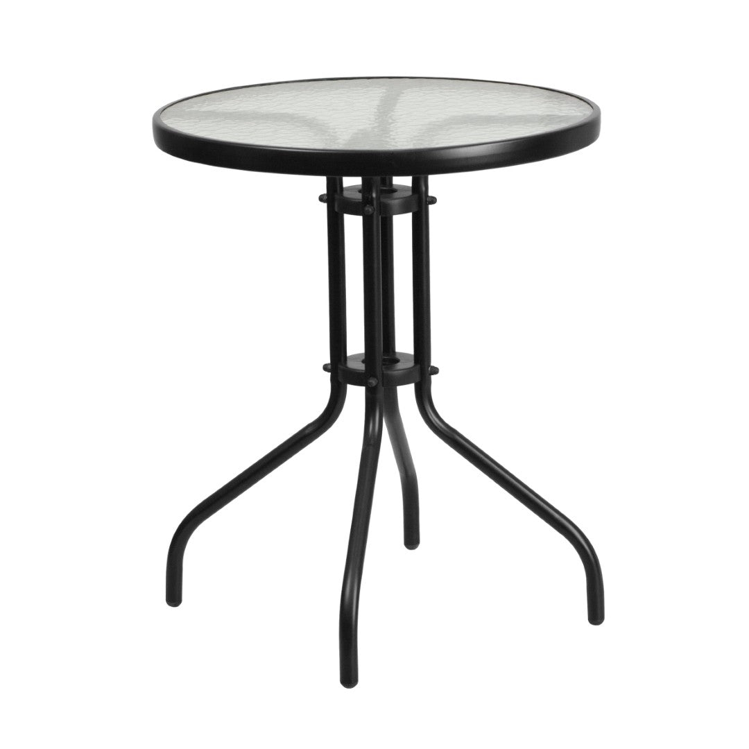- Key dimensions: Table overall: 23.75"W x 23.75"D x 28"H; Table top: 23.75" round, 5mm tempered glass with 1.25" edge; Base footprint: 17" W. Chair overall: 21.5"W x 24"D x 28.5"H. (Back: 12"W x 15.5"H; Seat: 16.75"W x 14"D x 17"H.)