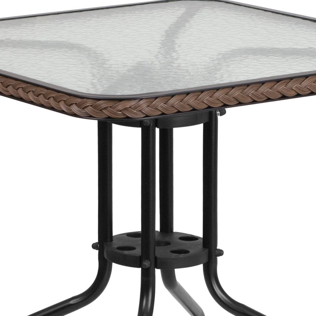 - Square Table: Top Size: 28" Square, 5mm Thick Glass, 1.375" Edge Top, Decorative Black Rattan Edge Band