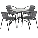 - Set includes one square table and four stackable chairs—ideal for compact dining areas, cafés, or patios.