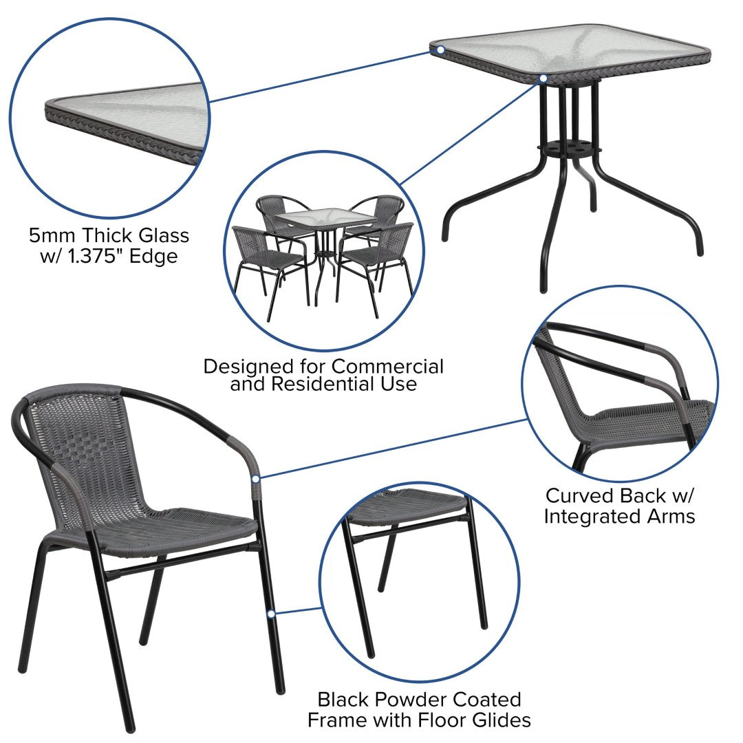 Serve up style and comfort for patios, decks, cafes, or indoor dining with this compact yet sturdy 5-piece set. The 28" square rippled glass table with a sleek black rattan edge and four matching stackable chairs blends modern metal construction with textured rattan detail to create a cohesive, commercial-ready look that’s equally at home in casual residential settings.