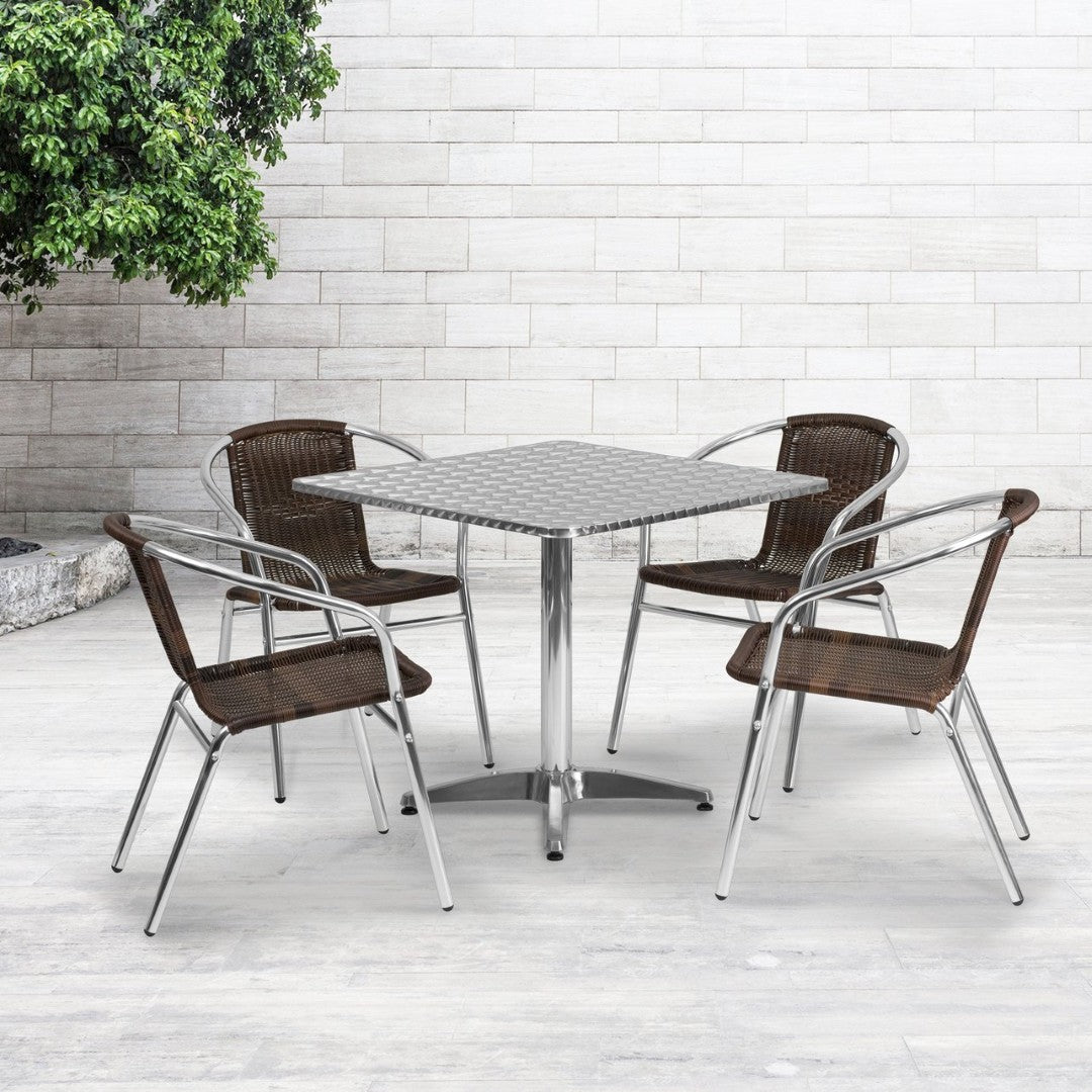 Create an inviting indoor or outdoor dining area with this contemporary 5-piece set that blends commercial-grade durability with bistro-style design. The compact square table and four stackable chairs are built for frequent use in cafes, restaurants, hotels, patios or home dining spaces—offering stable support, easy maintenance, and a neutral beige rattan finish that complements a wide range of decors.