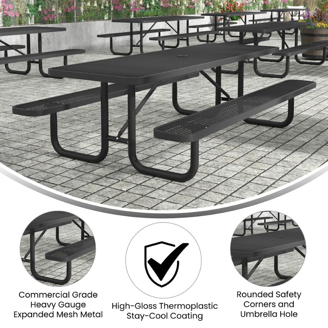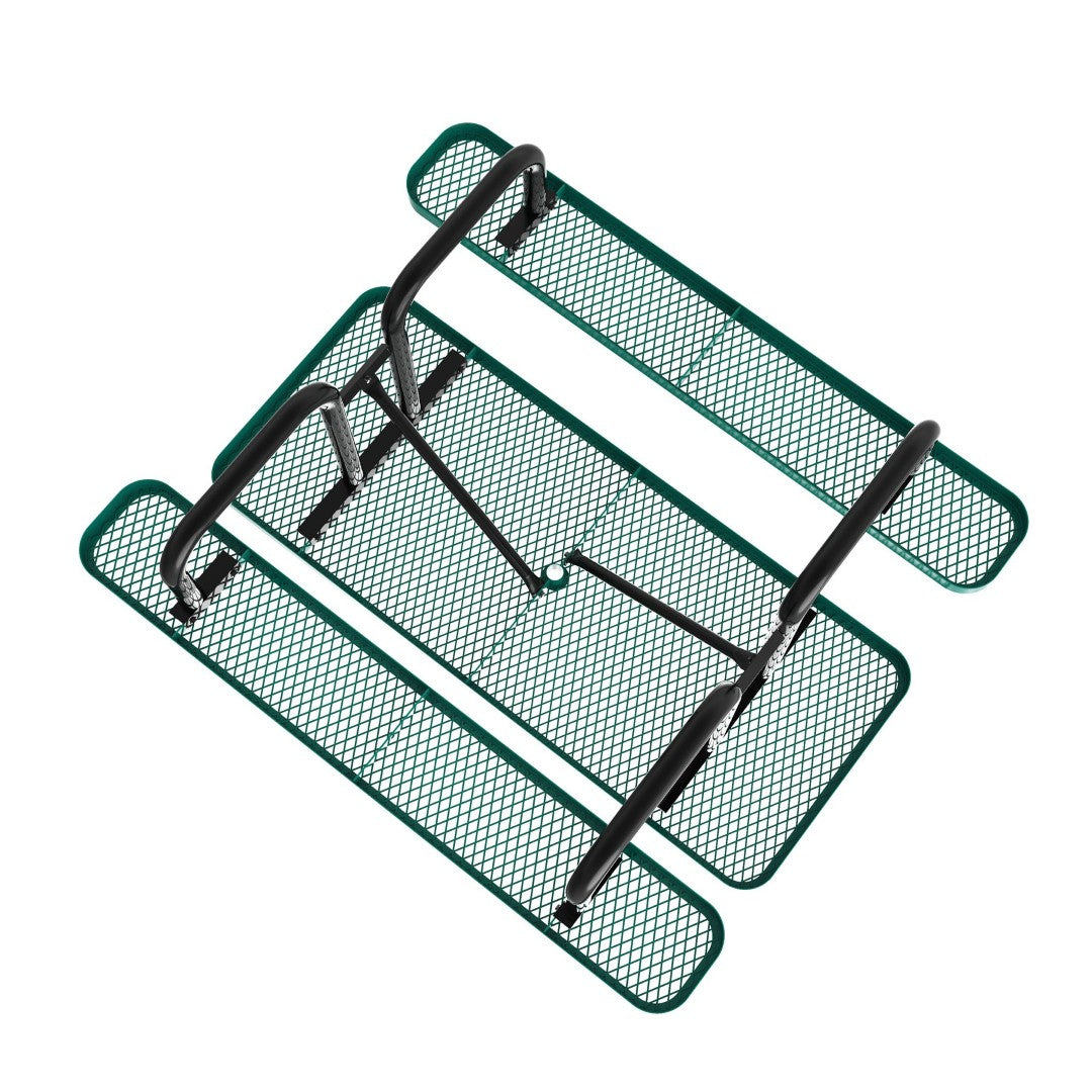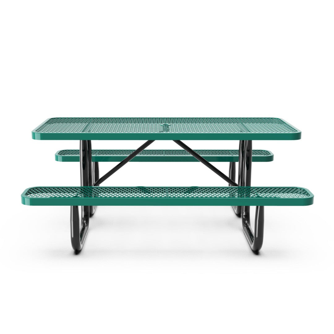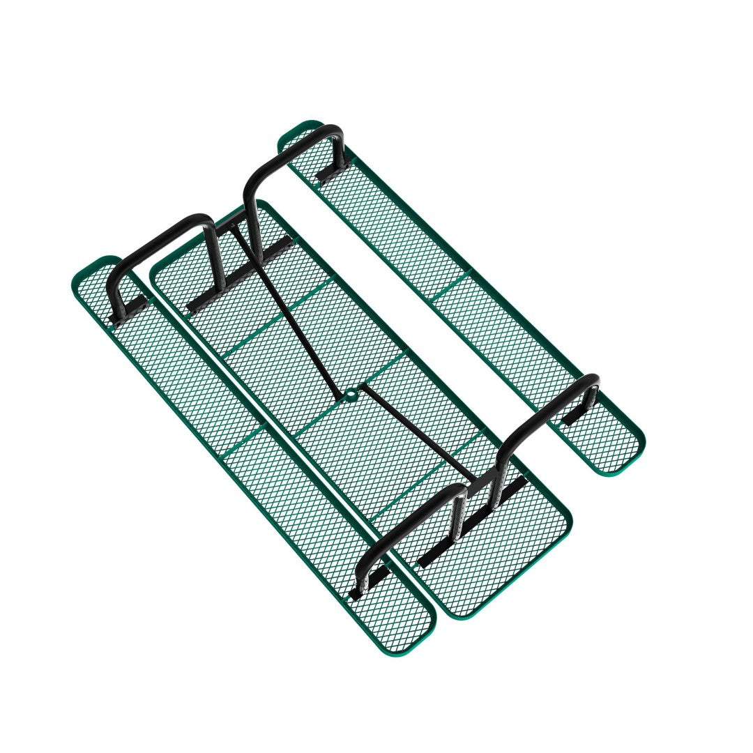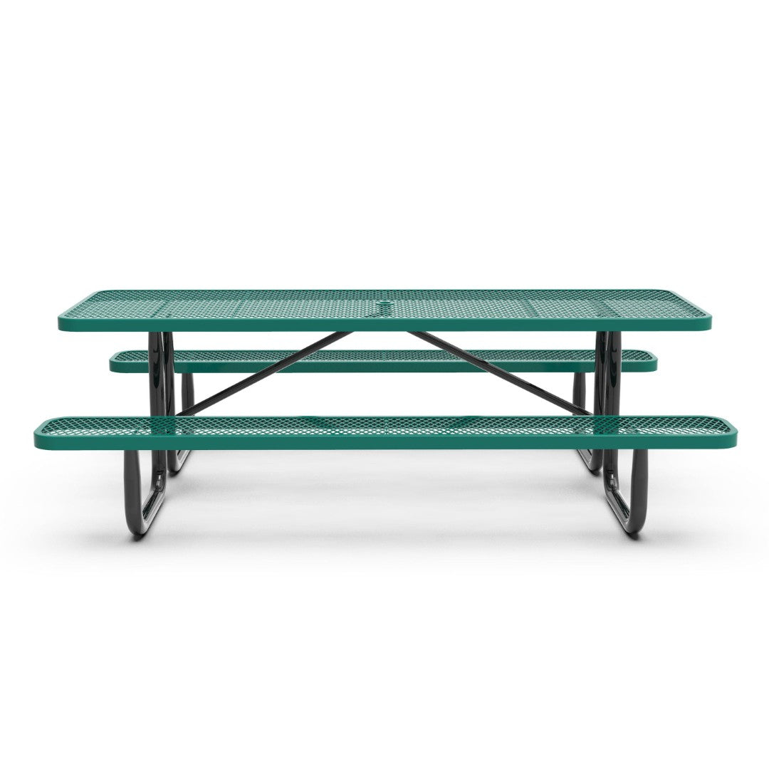 Durable, low-maintenance, and built for busy outdoor spaces, this commercial-grade picnic table combines heavy-gauge expanded metal mesh with a powder-coated steel frame to deliver long-lasting performance and comfort. Designed for campuses, parks, concession areas, and other high-traffic locations, the table resists fading, stays comfortable in sun, and includes an umbrella hole for added shade — all while supporting practical daily use and easy upkeep.