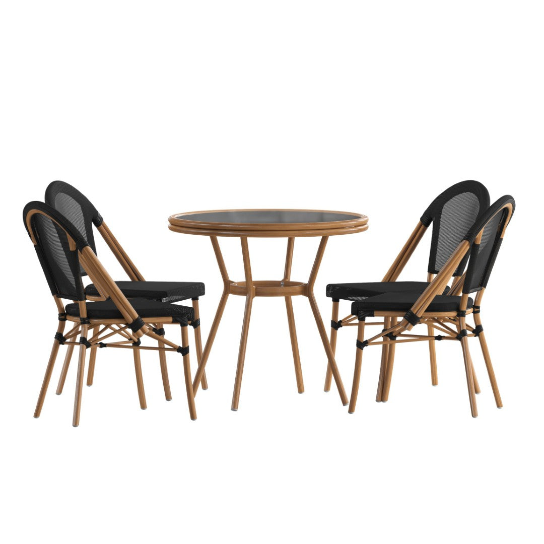 Bring the charm of a Parisian bistro to your commercial or residential space with this durable, low-maintenance 5-piece set. Designed for restaurants, cafés, hotels, and patios, the collection pairs a tempered-glass topped table with four breathable textilene chairs mounted on powder-coated aluminum frames that mimic a rich bamboo finish. The kit balances commercial-grade strength with lightweight portability and easy upkeep for fast seating turnover and long-lasting curb appeal.