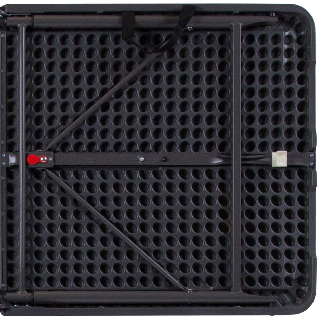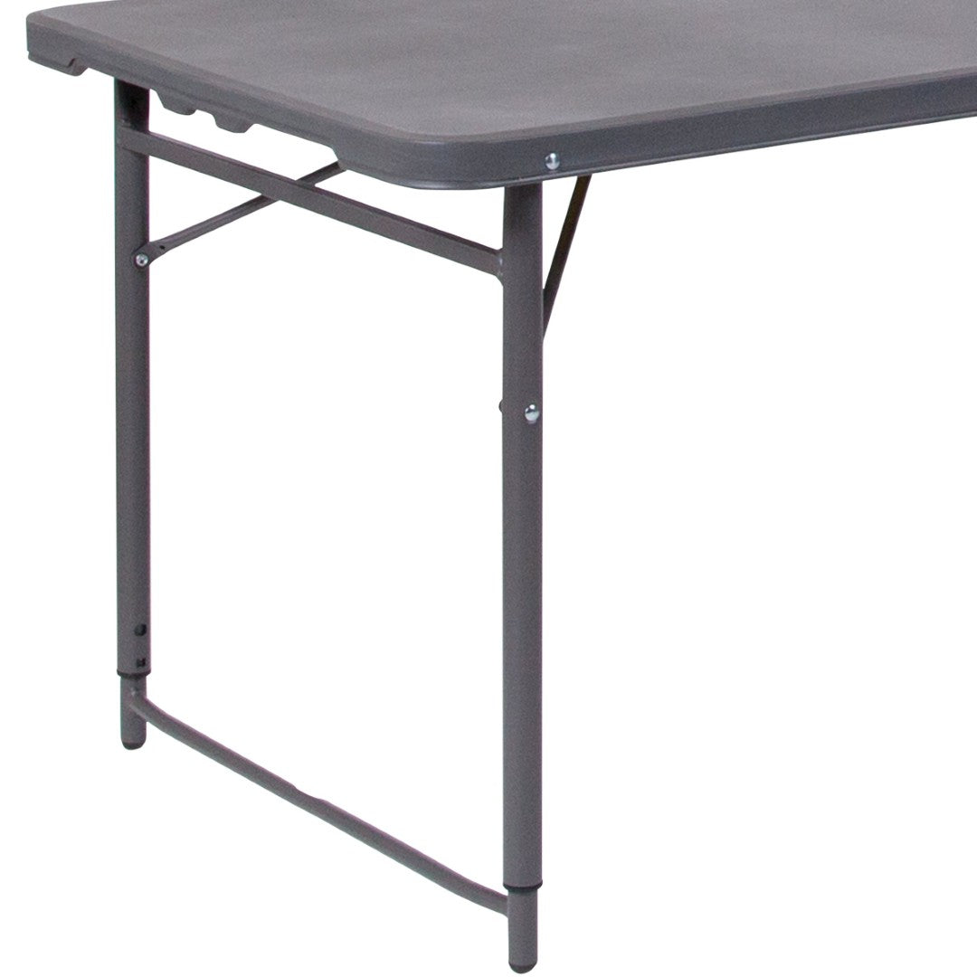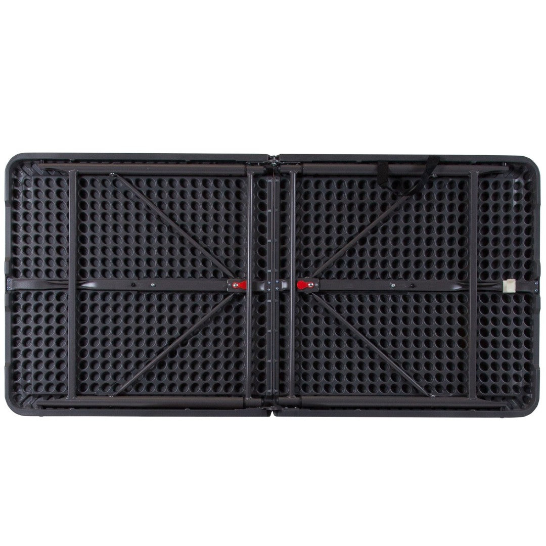 Entertain, work, or host with confidence using this sturdy, versatile bi-fold folding table. Designed for both indoor and outdoor use, its durable dark gray polyethylene top and powder-coated steel frame deliver a professional look and commercial-strength performance — yet it folds in half and carries easily for storage and transport. Adjustable height, protective floor caps, and a high weight capacity make it ideal for banquets, trade shows, craft projects, patio barbecues, or extra seating at home.