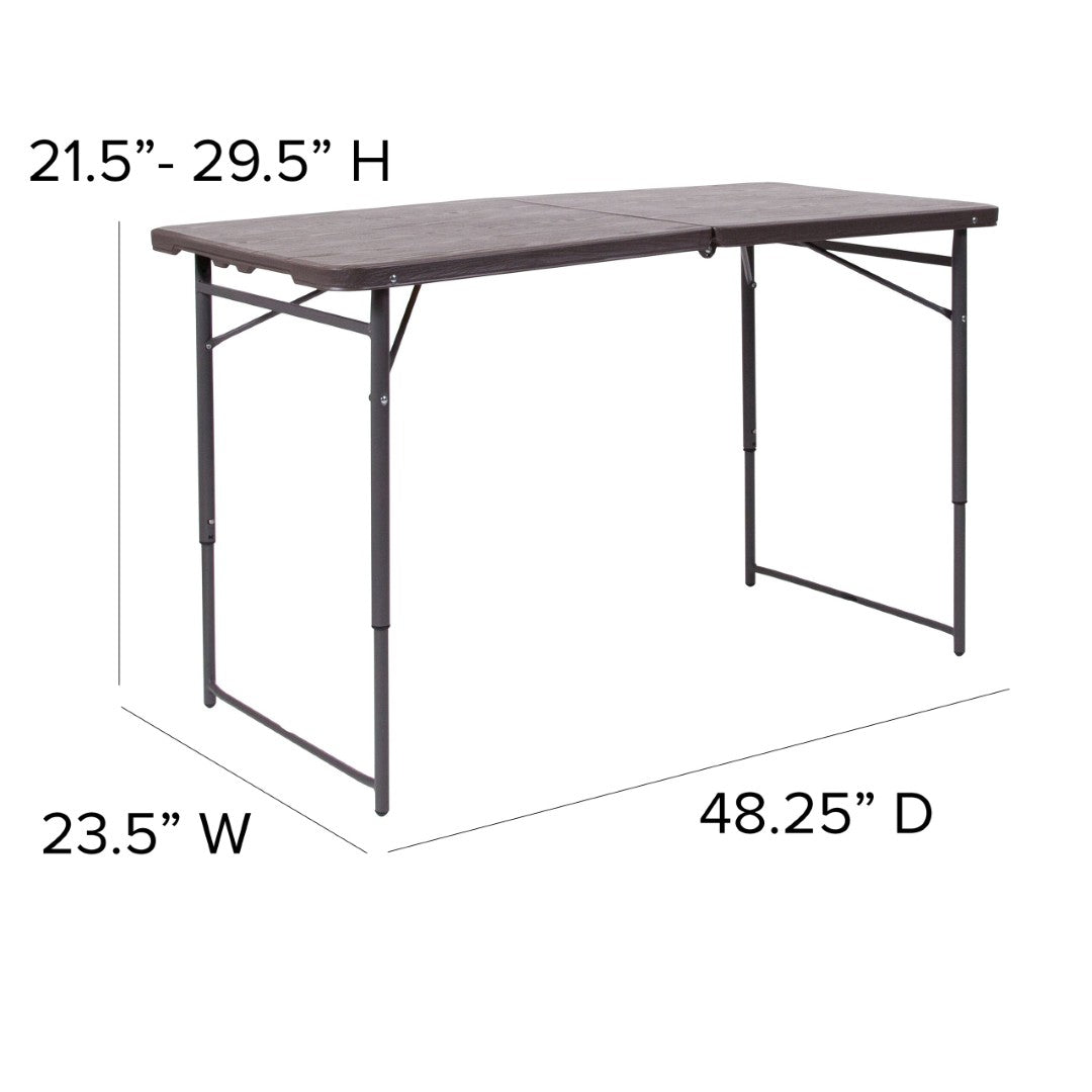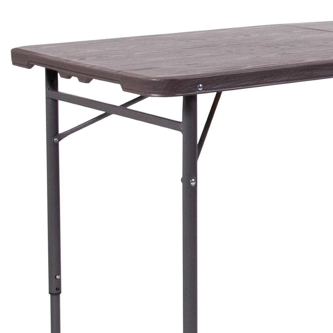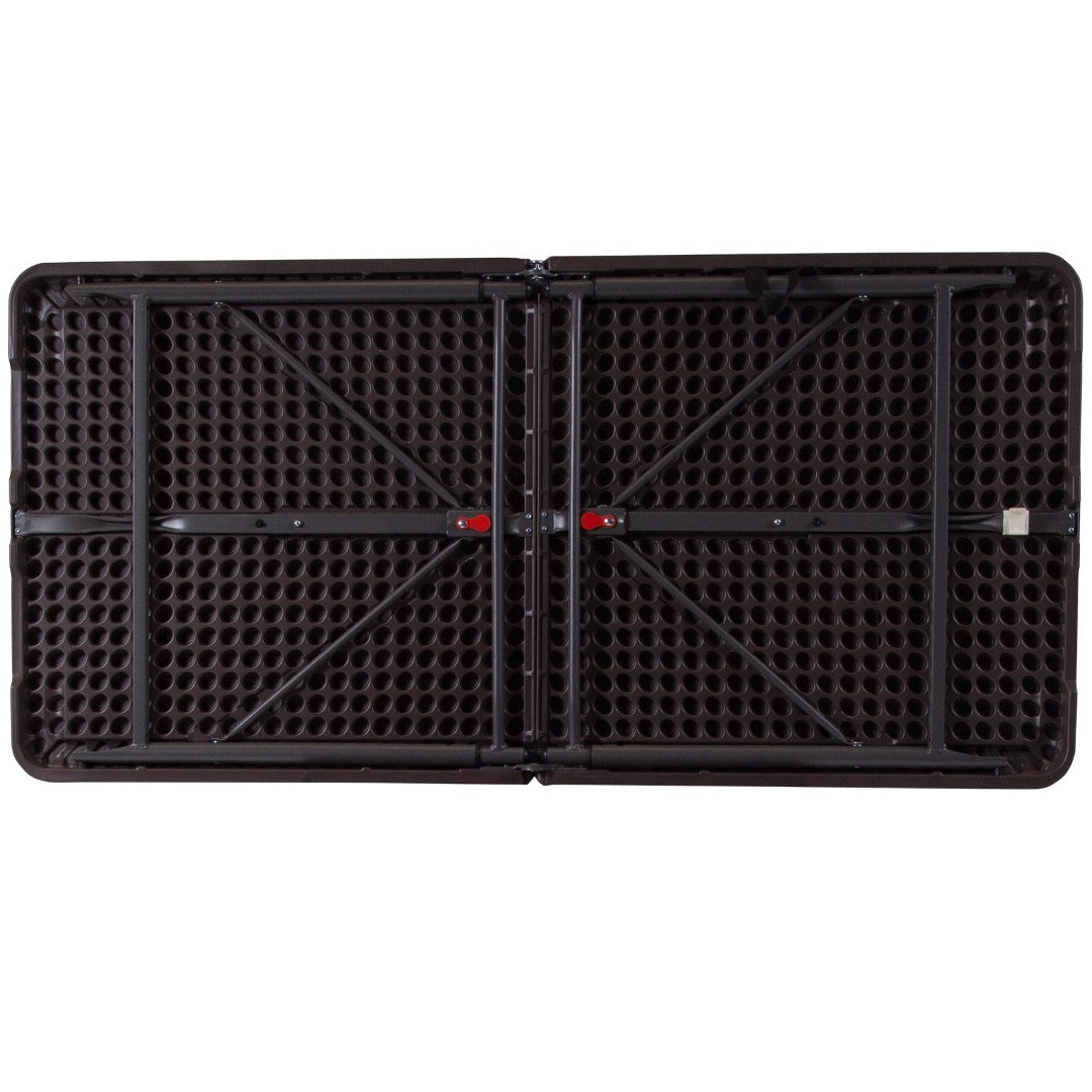 Entertain, work, or host with confidence using this sturdy, versatile bi-fold folding table. Designed for both indoor and outdoor use, its durable dark gray polyethylene top and powder-coated steel frame deliver a professional look and commercial-strength performance — yet it folds in half and carries easily for storage and transport. Adjustable height, protective floor caps, and a high weight capacity make it ideal for banquets, trade shows, craft projects, patio barbecues, or extra seating at home.