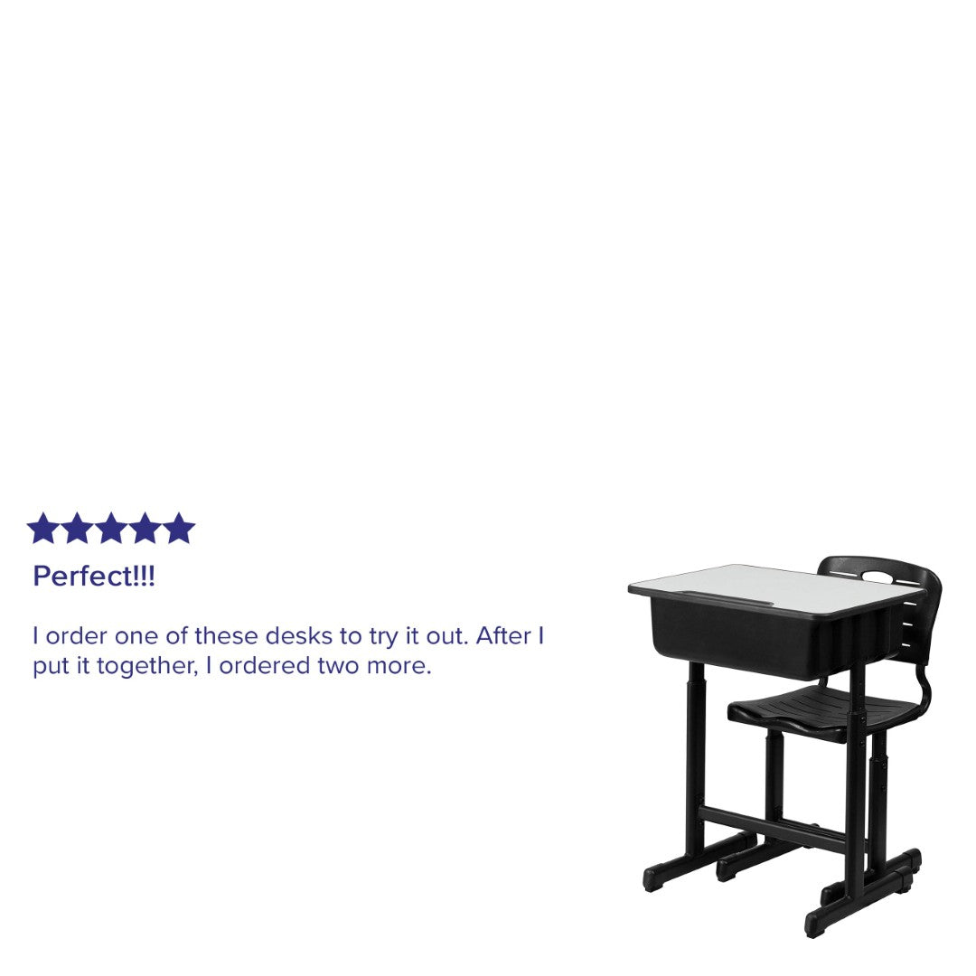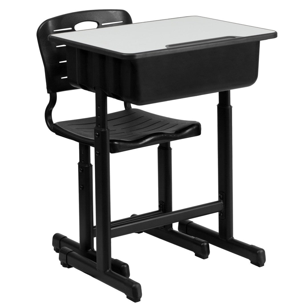 - Adjustable height: Both desk and chair feature pedestal frames with adjustable legs — desk raises up to 3" and chair height adjusts to fit growing students.