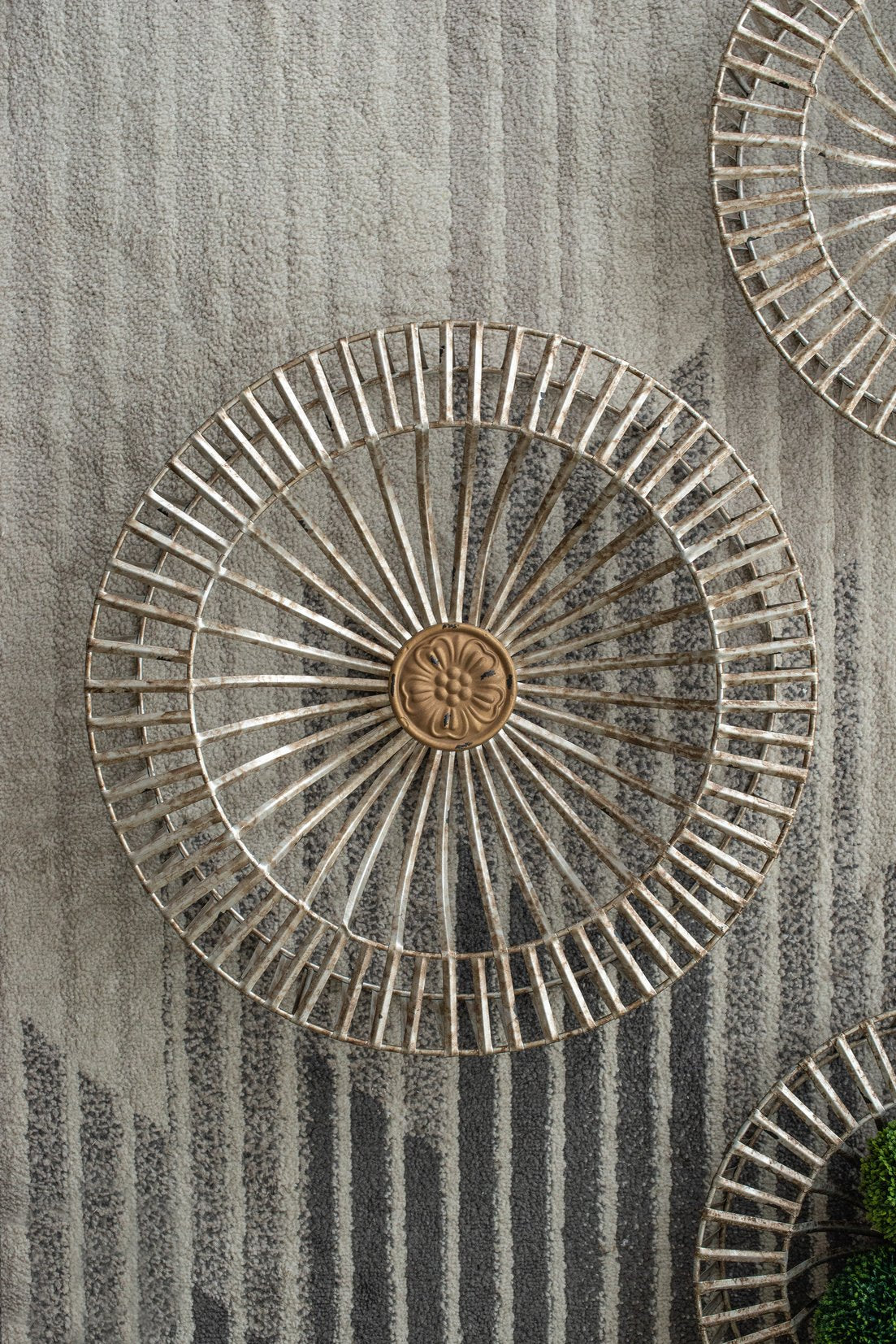 Add a bold, sculptural focal point to your wall with this set of three Jennings metal discs. Each piece combines a shield-like silhouette with a raised floral medallion center, blending architectural strength and classical ornamentation to suit mantels, desks, entryways, or gallery walls. The textured metal finish catches light and creates depth, while the coordinated trio provides balanced visual interest whether hung together or grouped with other décor.