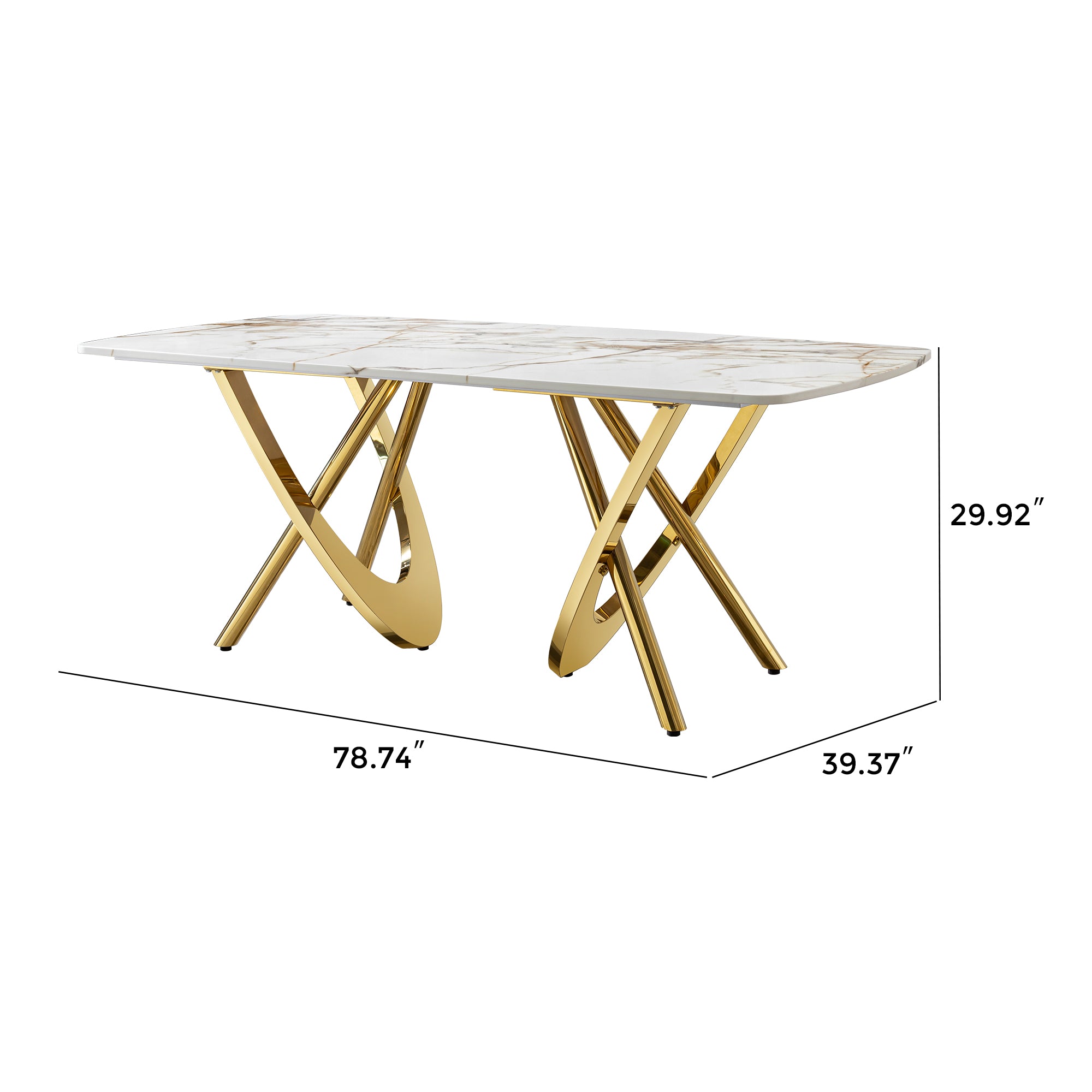 Upgrade your dining space with this sophisticated 7-piece set that blends modern design with durable construction. The rectangular MDF tabletop features a marble pattern and mirrored finish, complemented by a gold stainless steel base and six matching chairs with snake-like backrests for a refined, contemporary look ideal for family meals and entertaining.