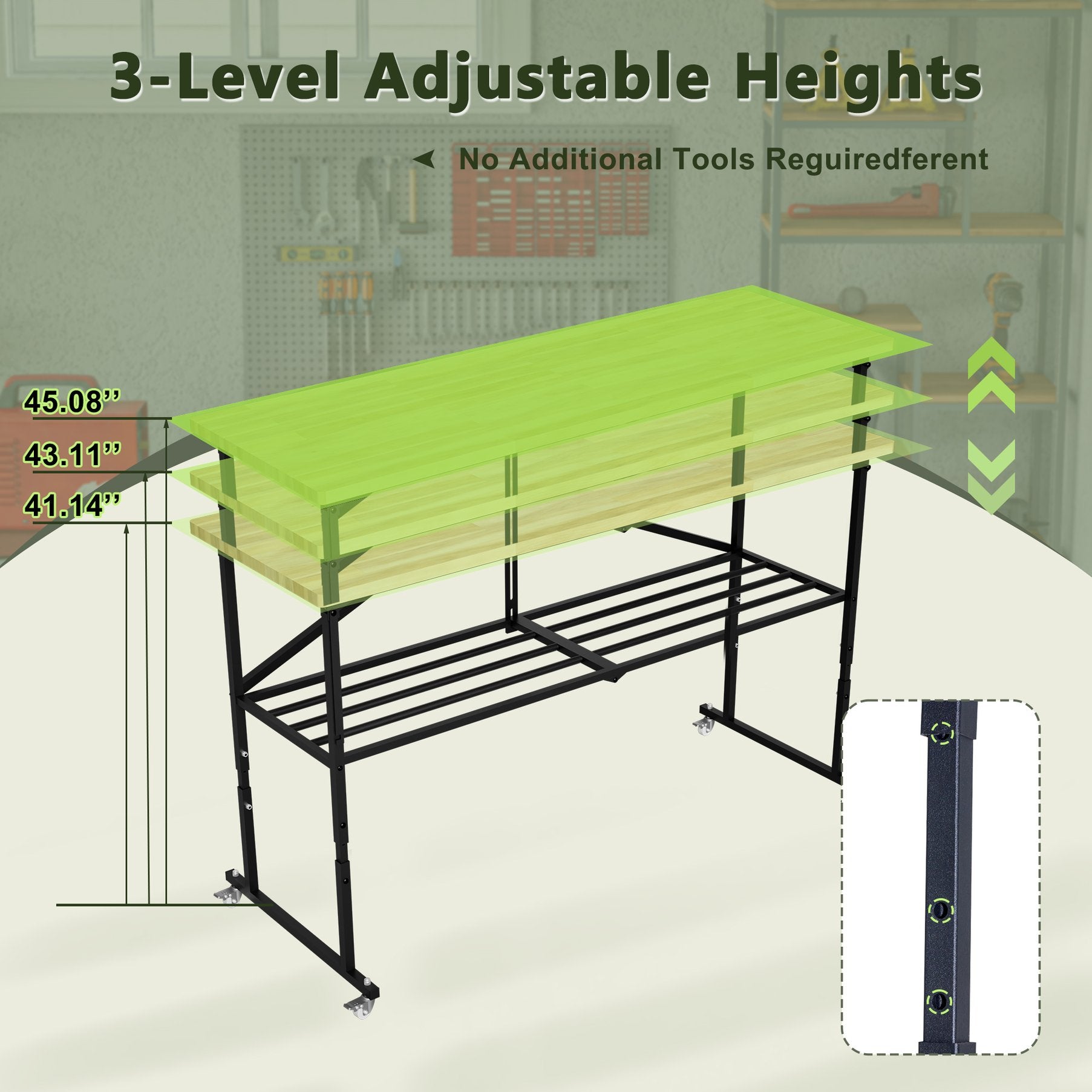 - Adjustable height: Telescoping legs allow the work surface to be set between 41.14" and 45.08" to suit different tasks and users.