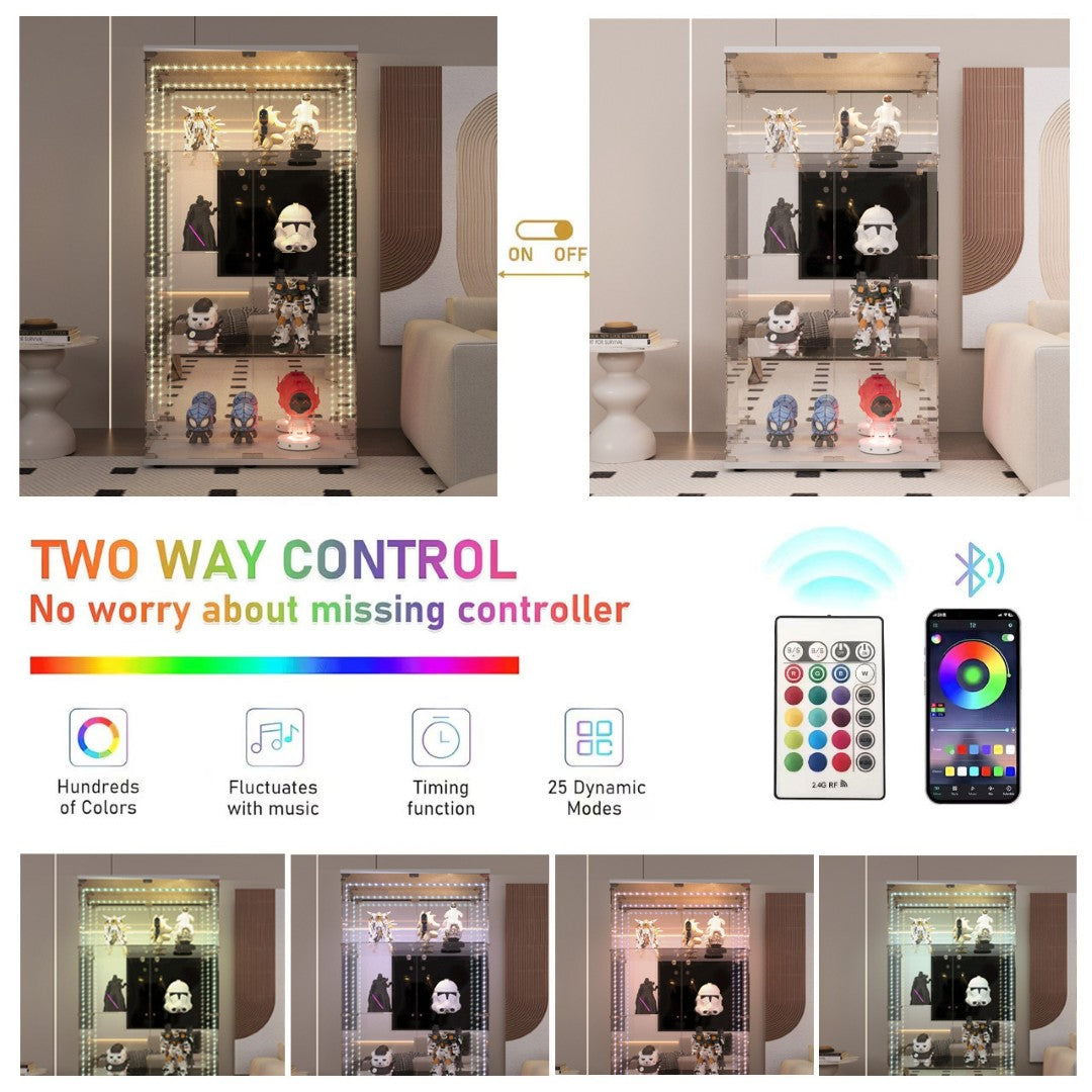 - This tempered glass cabinet comes with a Bluetooth LED light strip that can be controlled by both a remote control and a mobile app. It can also dance the rhythm of surrounding music and will sense your presence to turn on the lights for you. The design of the light strip adds a mysterious and romantic atmosphere to this cabinet.