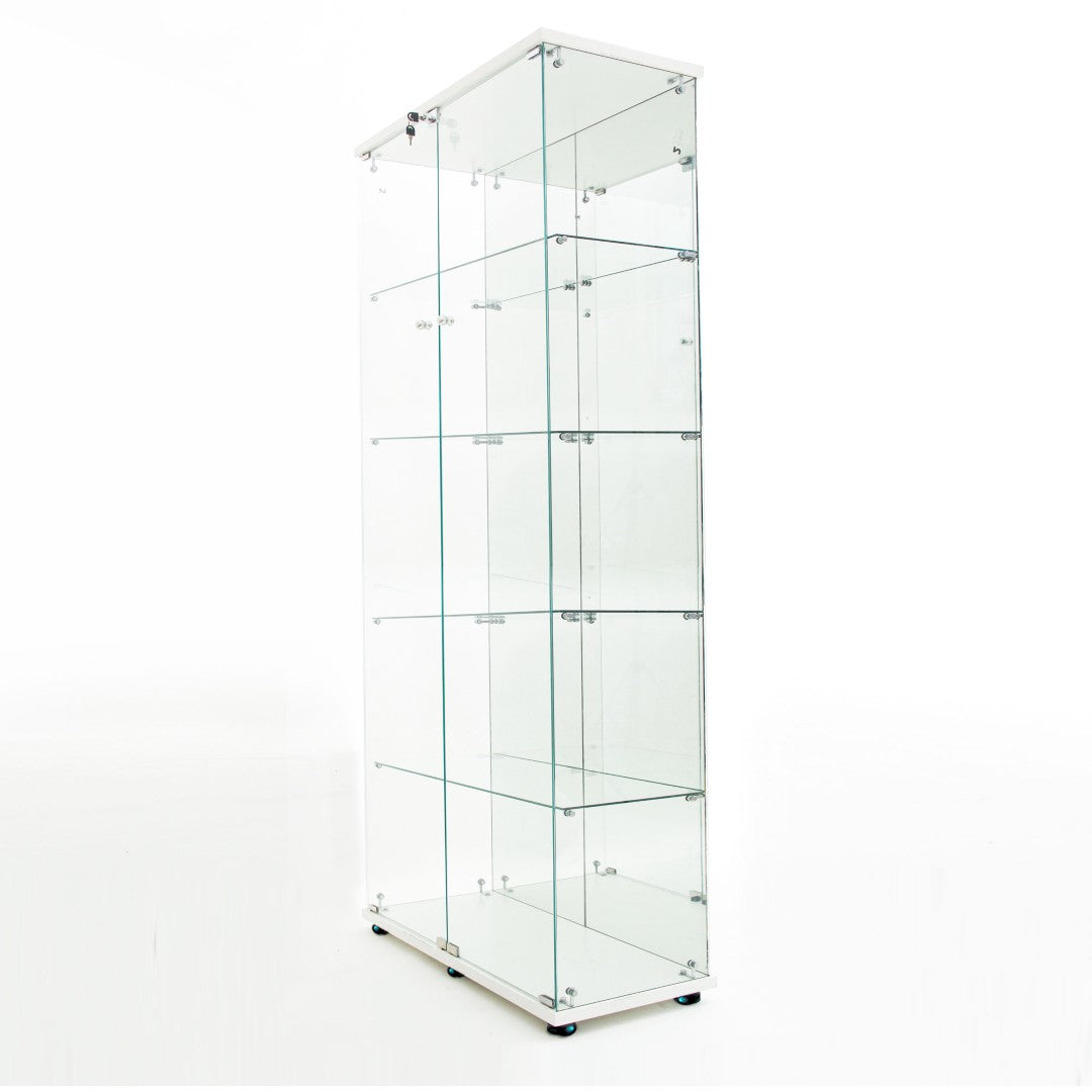 - Materials: White particle board frame with tempered glass panels and a mirrored back panel for enhanced display depth and brightness.