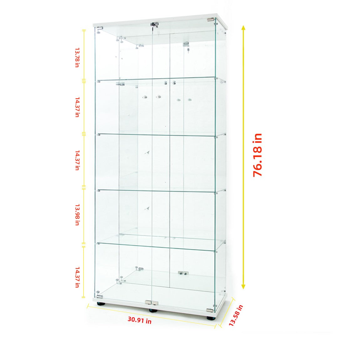 - Tempered Glass Display Cabinet: Measures74.80" (H) x30.91" (L) x13.58" (W), with an overall weight capacity of 110 lbs, each tempered glass shelf can hold up to 11lbs, Color: white