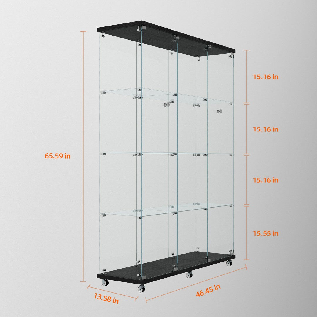 - Tempered Glass Display Cabinet: Measures65.28" (H) x46.85" (L) x13.58" (W), with an overall weight capacity of 110 lbs, each tempered glass shelf can hold up to 11lbs, Color: black