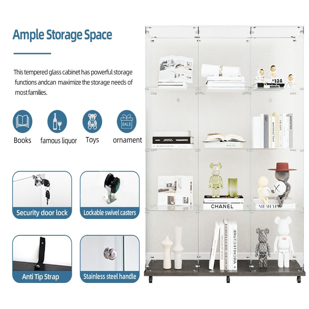 Elevate your storage and display with this sleek black tempered glass cabinet — a versatile piece that combines modern aesthetics, safety, and smart lighting. Ideal for living rooms, bedrooms, halls, or offices, it showcases collectibles, wines, files, or décor while offering convenient mobility and secure storage.