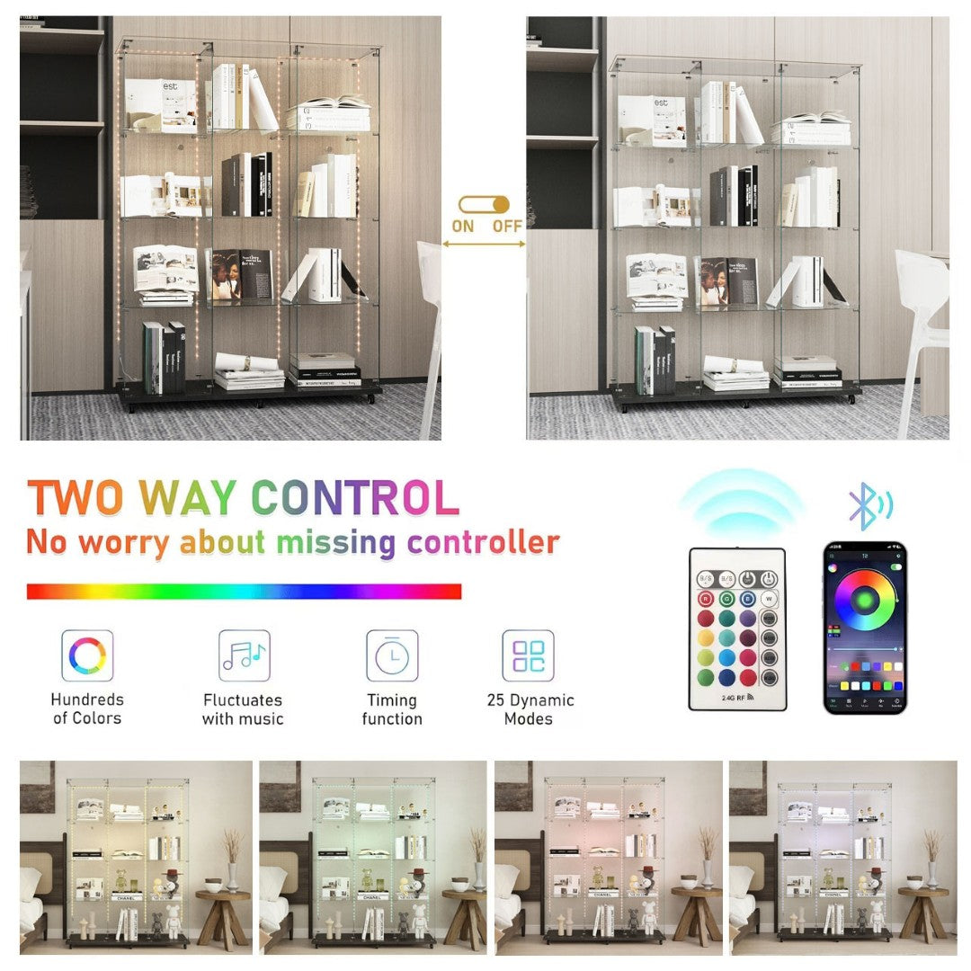 - This tempered glass cabinet comes with a Bluetooth LED light strip that can be controlled by both a remote control and a mobile app. It can also dance the rhythm of surrounding music and will sense your presence to turn on the lights for you. The design of the light strip adds a mysterious and romantic atmosphere to this cabinet.