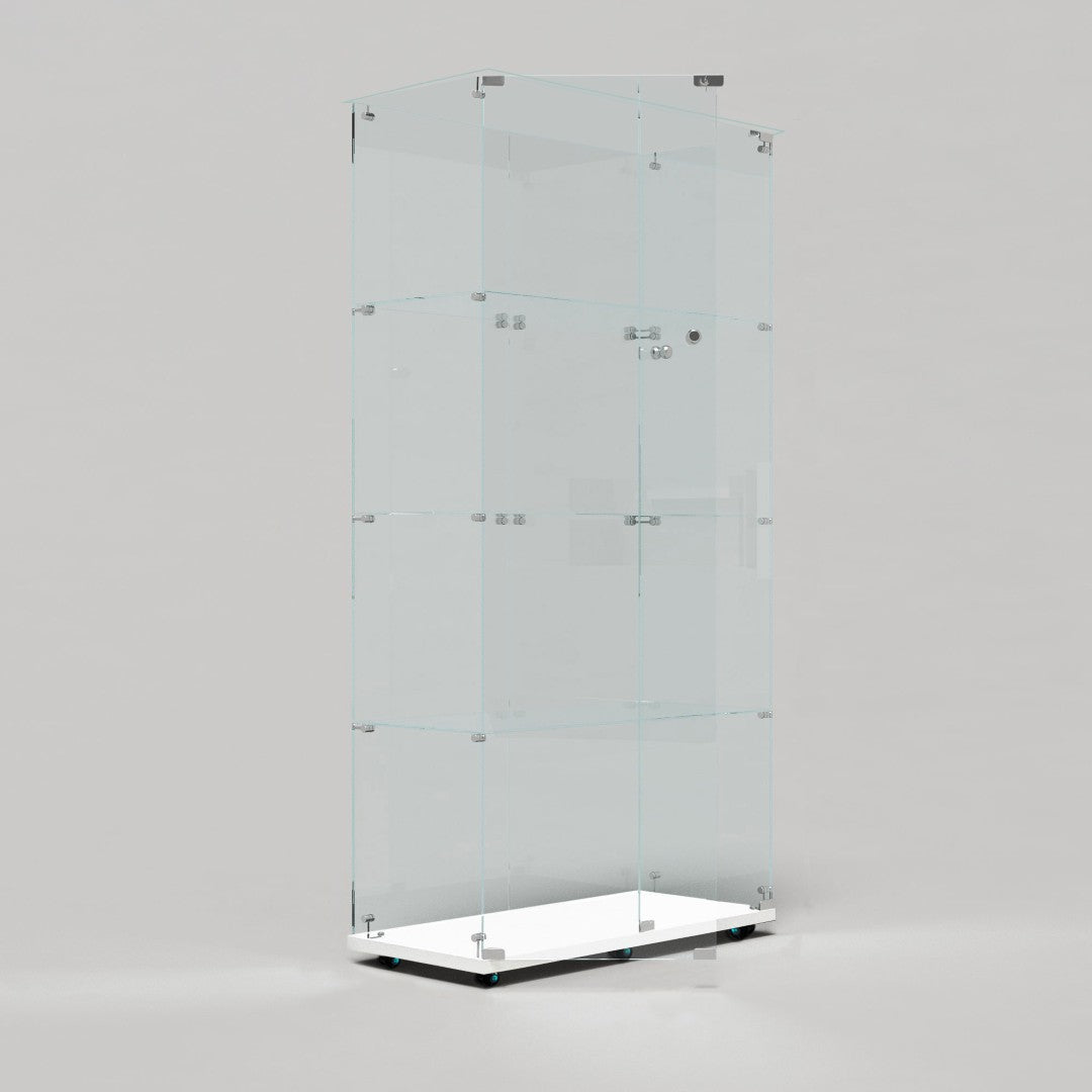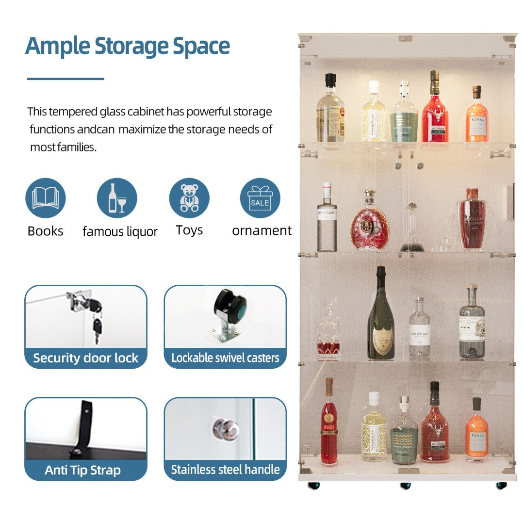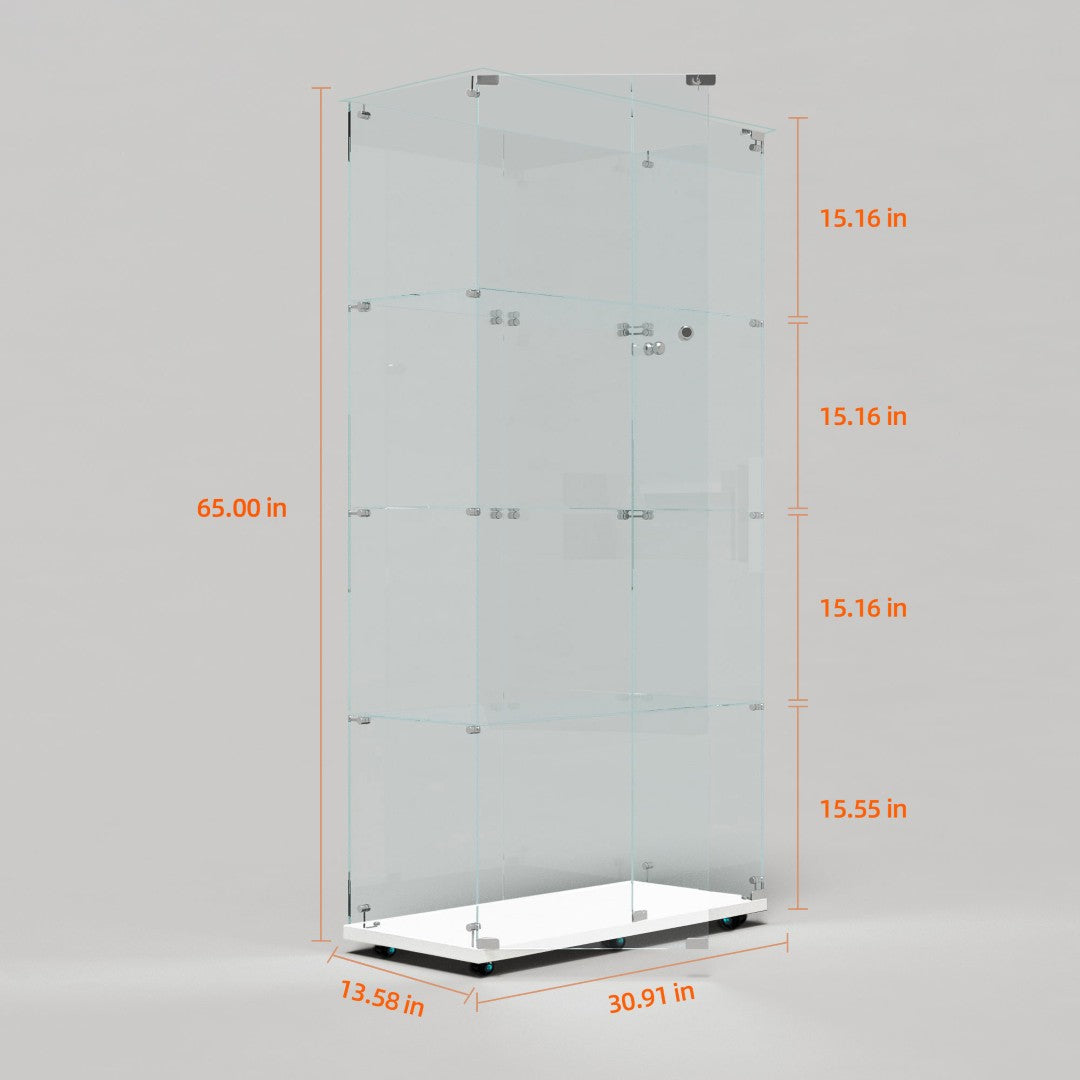 - Tempered Glass Display Cabinet: Measures65.00" (H) x30.91" (L) x13.58" (W), with an overall weight capacity of 110 lbs, each tempered glass shelf can hold up to11 lbs, Color: white