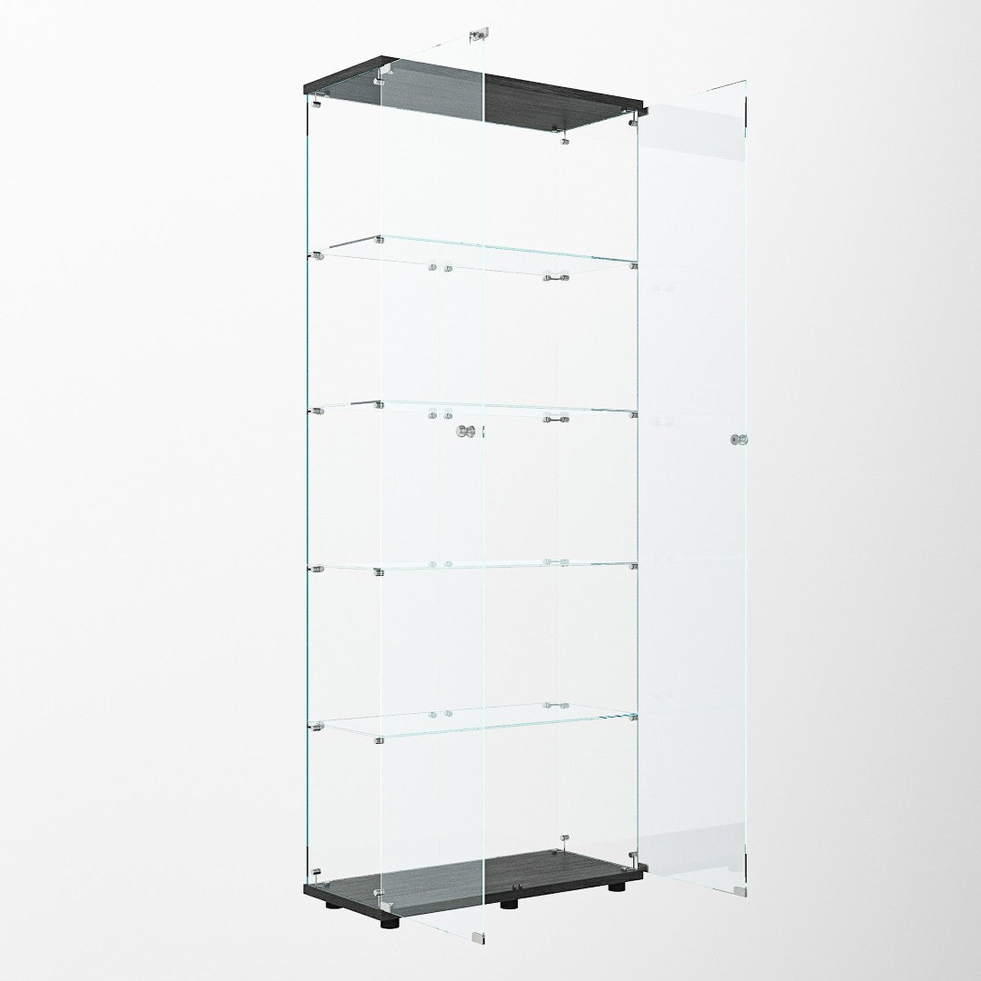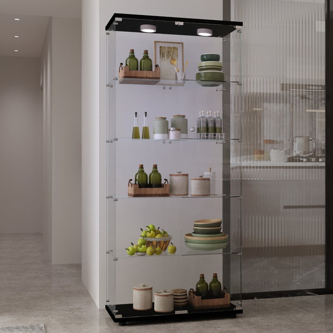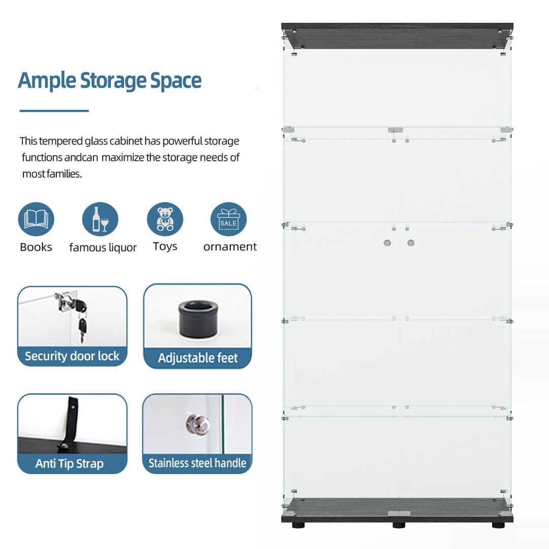 - Tempered Glass Display Cabinet: Measures74.80" (H) x30.91" (L) x13.58" (W), with an overall weight capacity of 110 lbs, each tempered glass shelf can hold up to 11lbs, Color: black