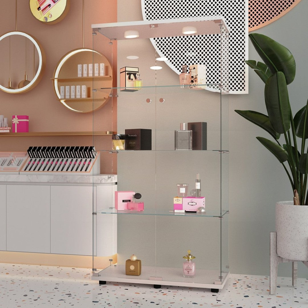Bring a sleek, modern showcase to any room with this versatile tempered glass display cabinet. Finished in crisp white and built with safety-tempered glass and sturdy particle board, it combines elegant presentation with practical storage — ideal for displaying collectibles, wine, files, or decorative items. Integrated color-changing LED lights and lockable casters add convenience and ambiance, while adjustable feet ensure stable placement on uneven floors.
